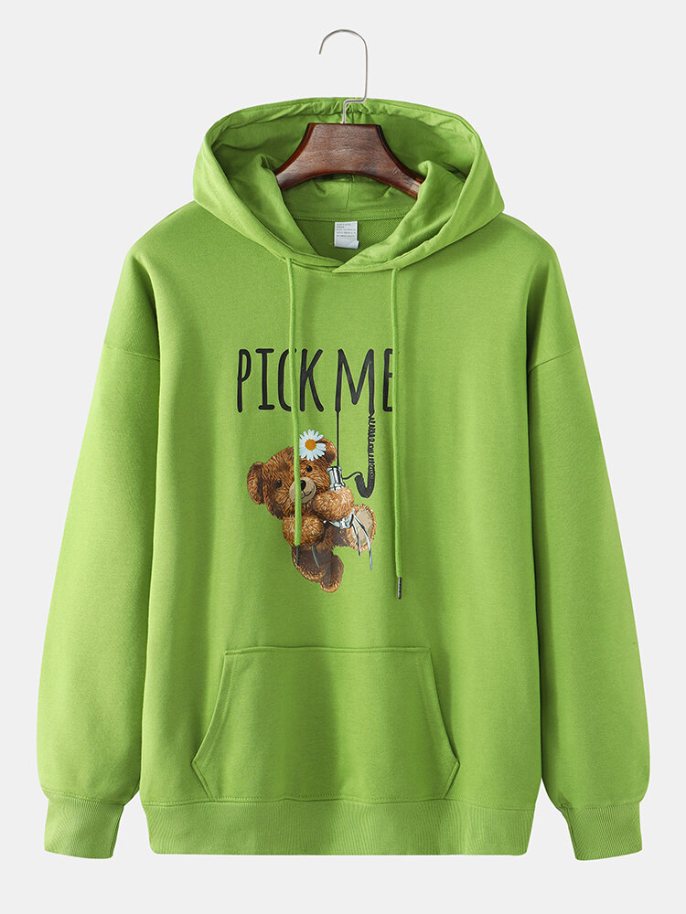Mens Cartoon Doll Bear & Letter Print Drop Shoulder Hoodies With Pocket – Yellow L