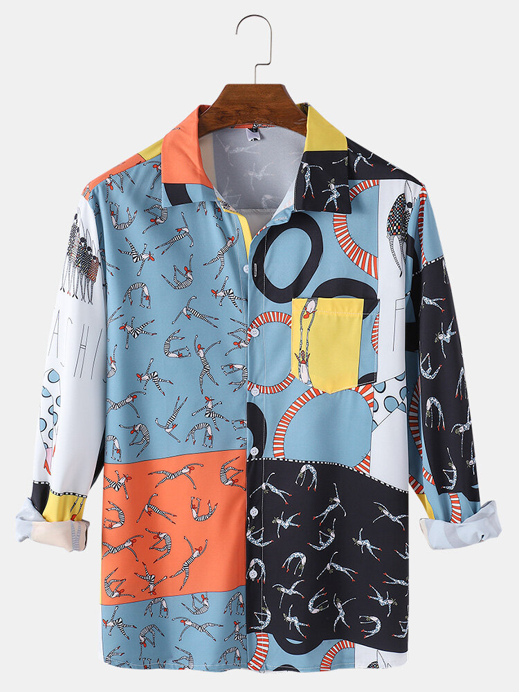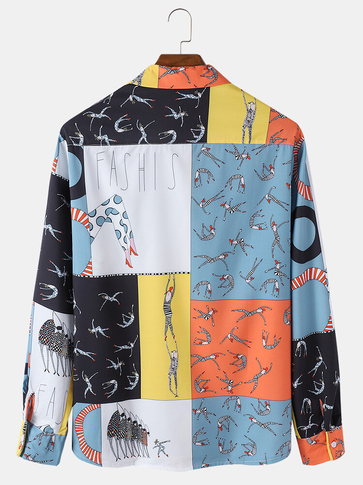 Mens Cartoon Figure Print Color Block Button Up Long Sleeve Casual Shirts – Green 2XL