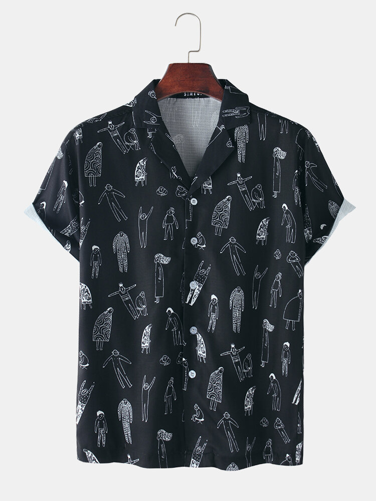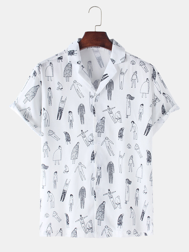Mens Cartoon Figure Print Revere Collar Short Sleeve Shirts – White M