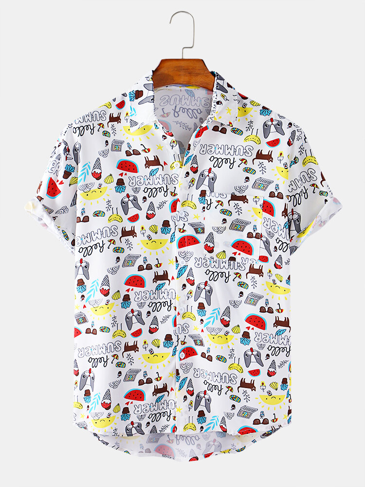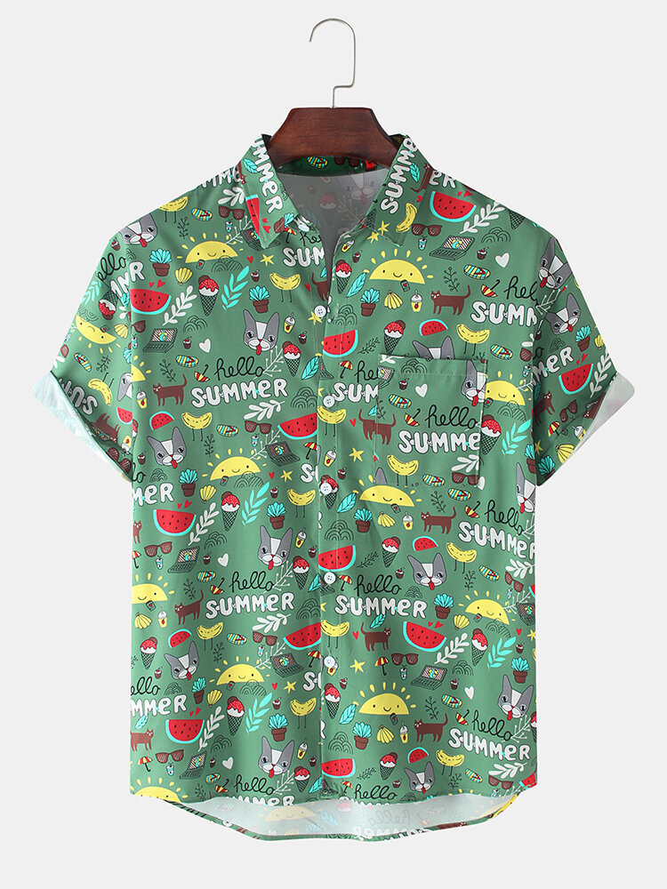 Mens Cartoon Fruit Animal Print Turn Down Collar Short Sleeve Shirts – Green L