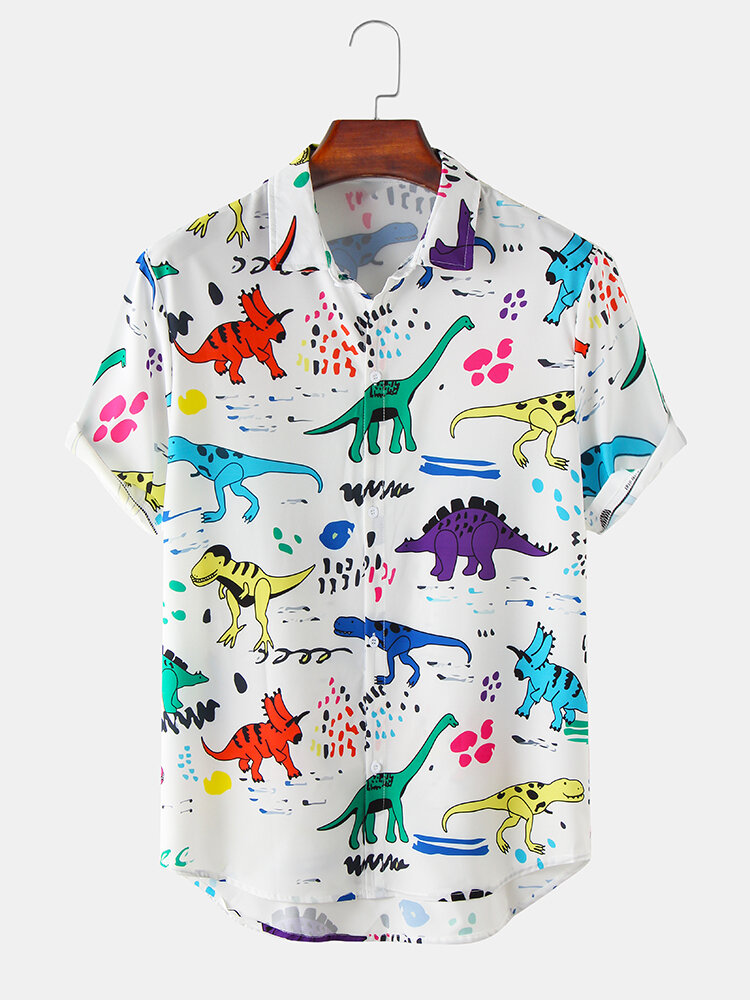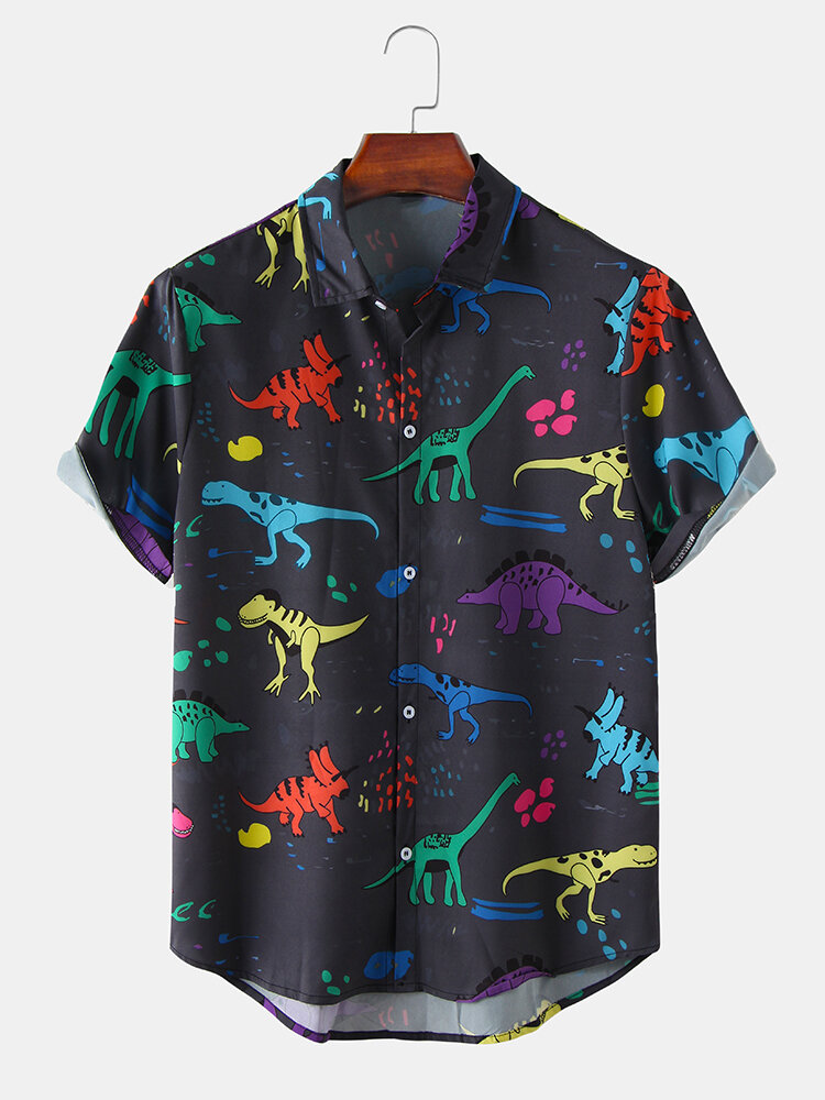 Mens Cartoon Funny Dinasour Pattern Short Sleeve Casual Shirts – Black S