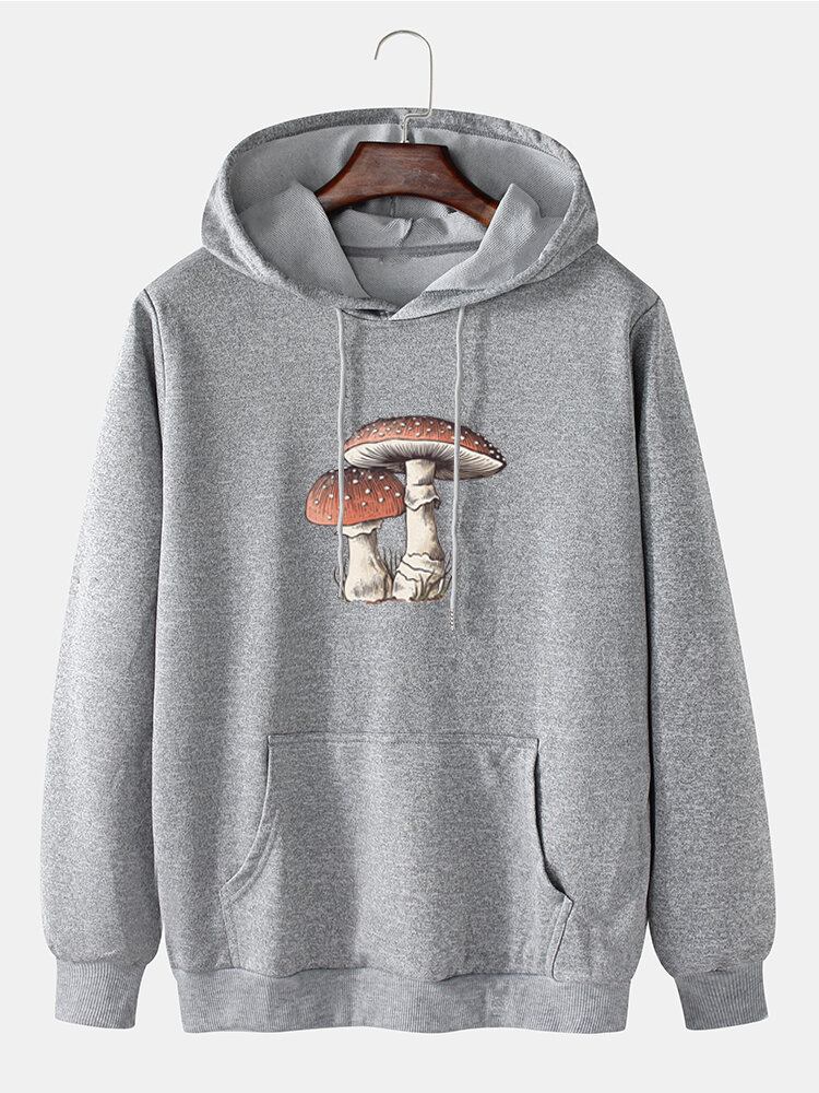 Mens Cartoon Mushroom Print Community Spirit Drawstring Pullover Hoodies – Black M