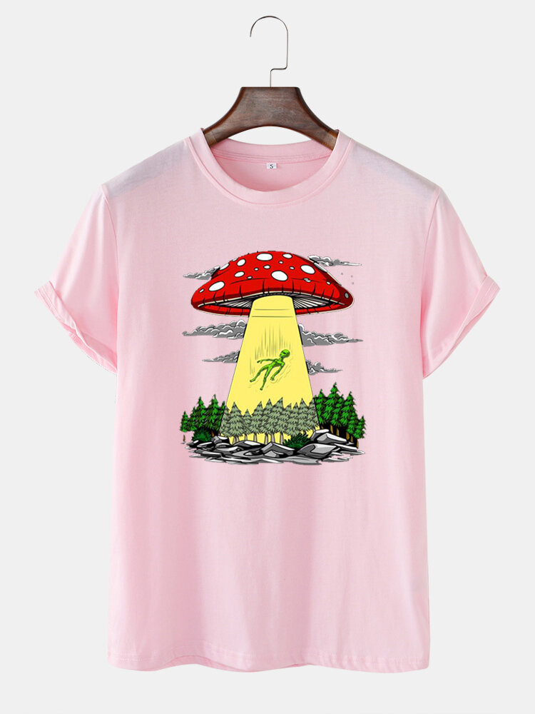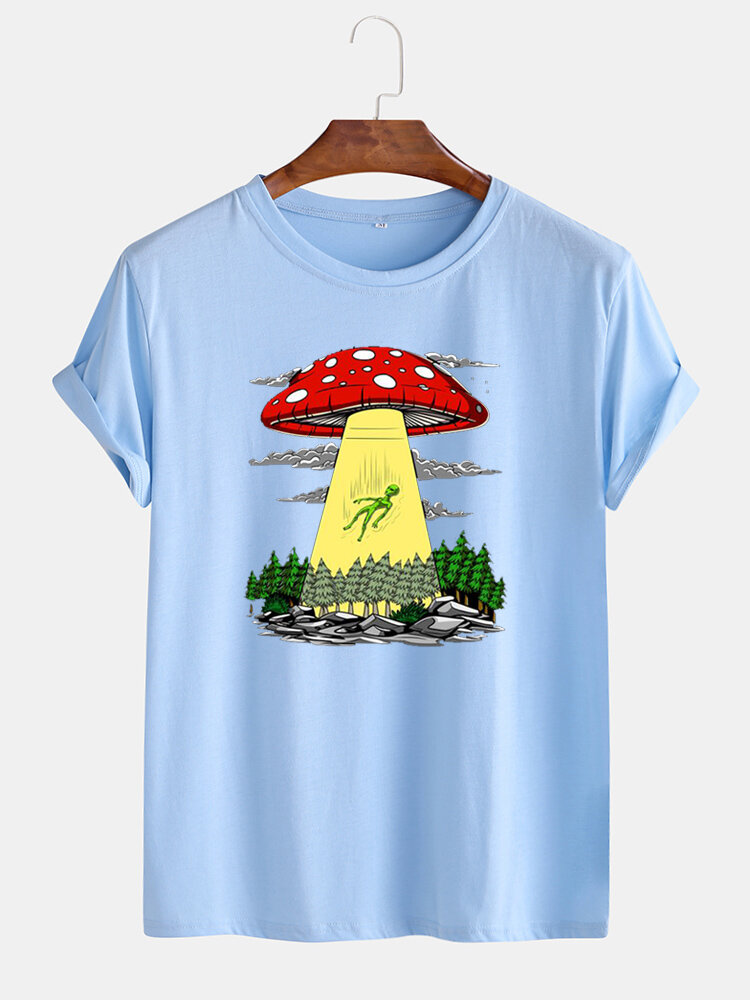 Mens Cartoon Mushroom Print Round Neck Short Sleeve T-Shirts – White S