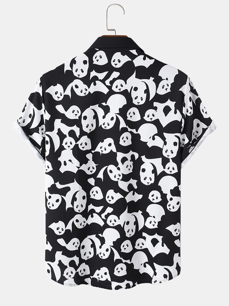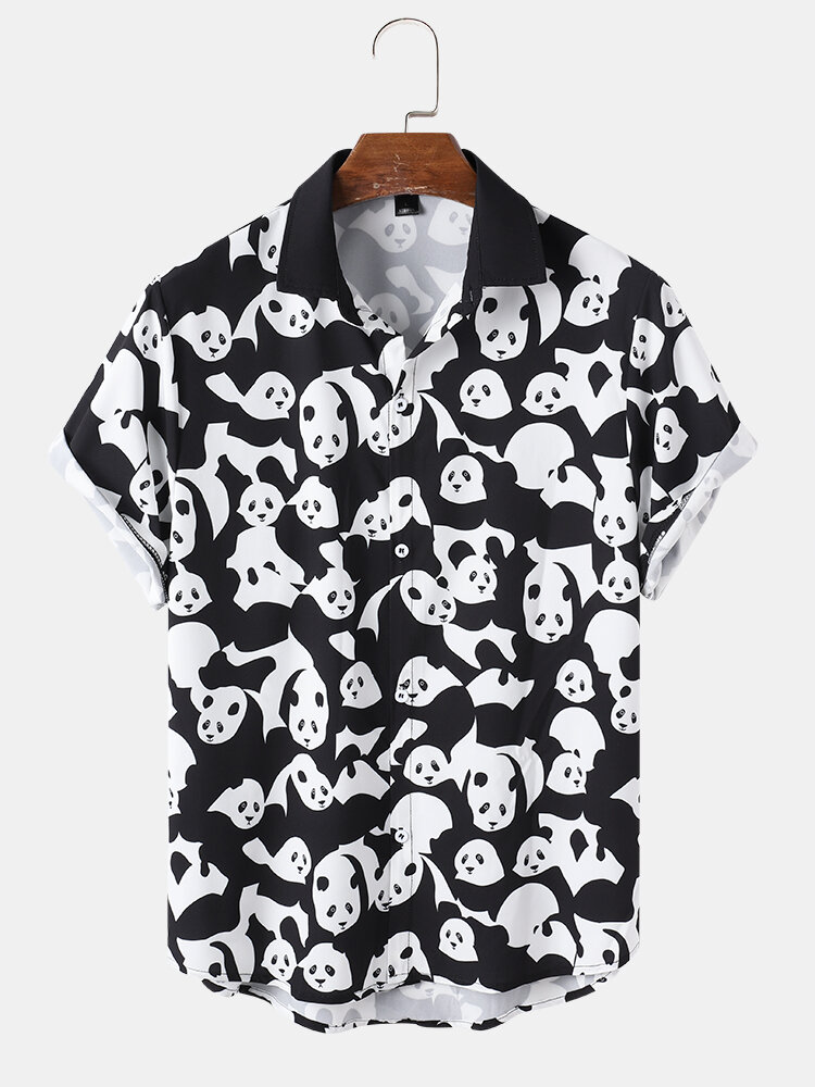 Mens Cartoon Panda Print Color Contrast Short Sleeve Shirt – Black S