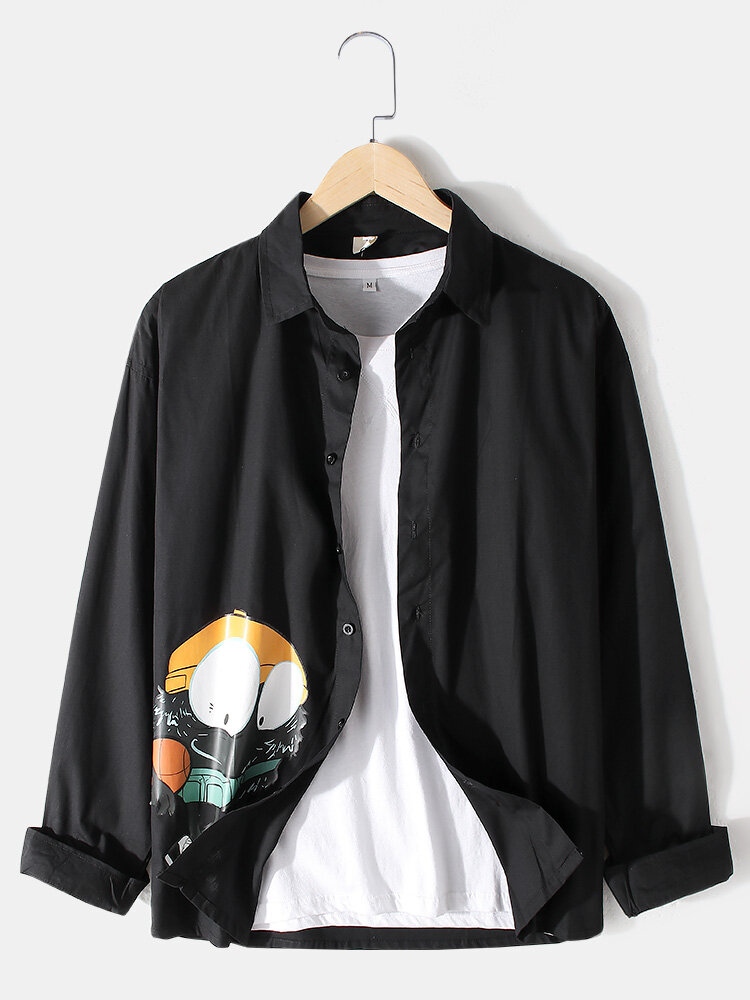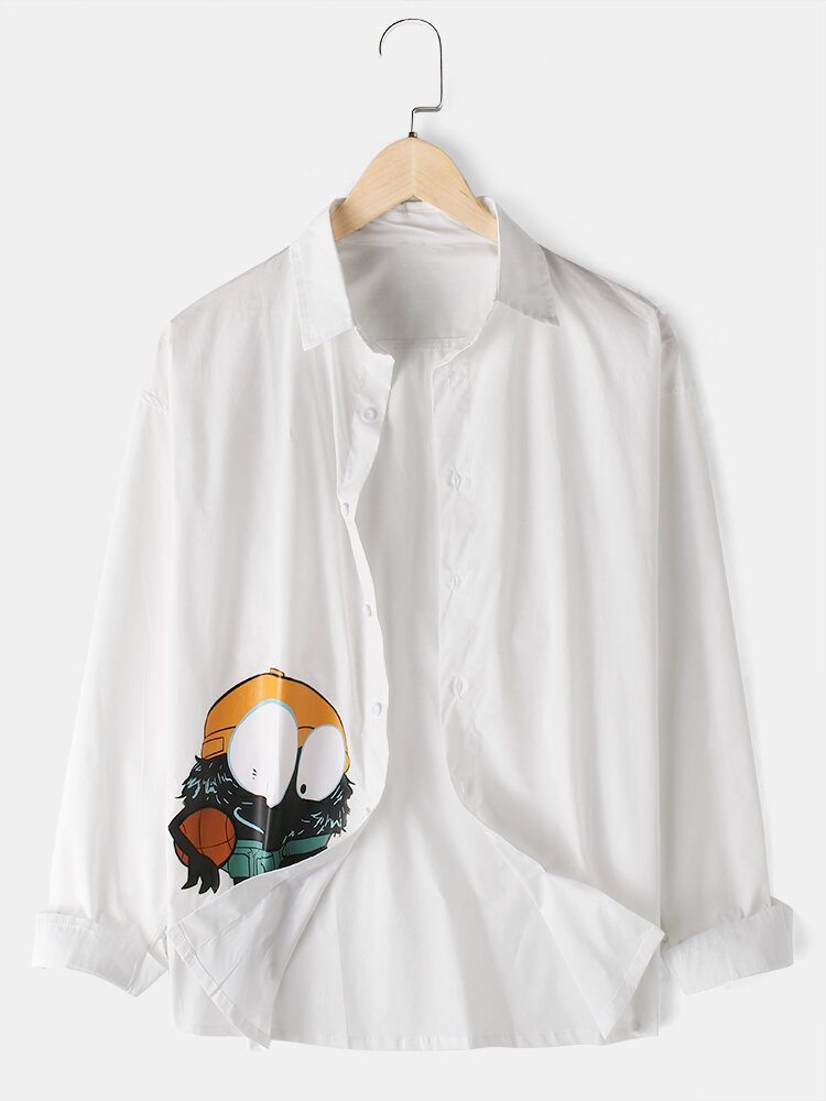 Mens Cartoon Ptint Button Up Lapel Long Sleeve Casual Shirts – White XL