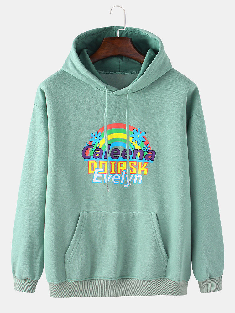 Mens Cartoon Rainbow Letter Print Hoodies With Kangaroo Pocket – Black S