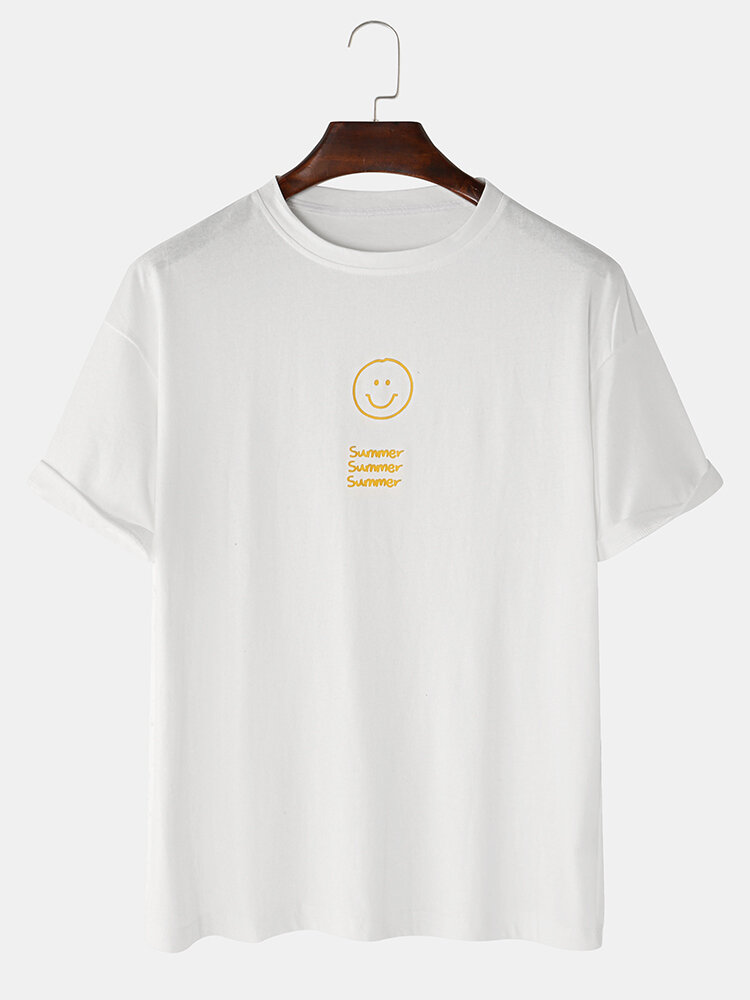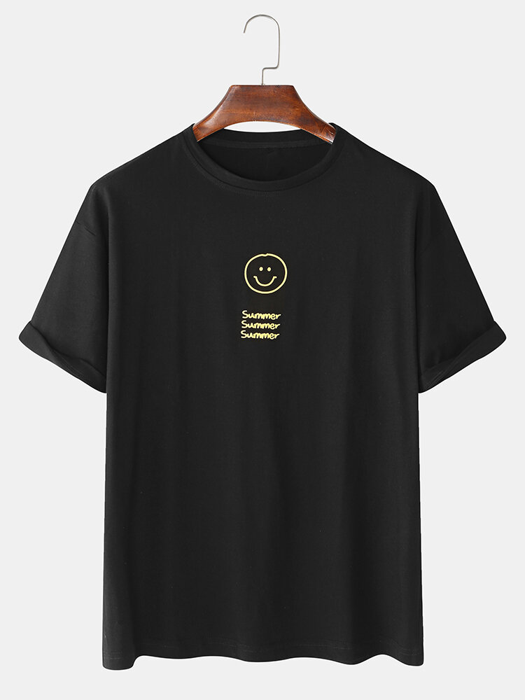 Mens Cartoon Smile Face Letter Print Cotton Loose Casual Short Sleeve T-Shirts – Black L