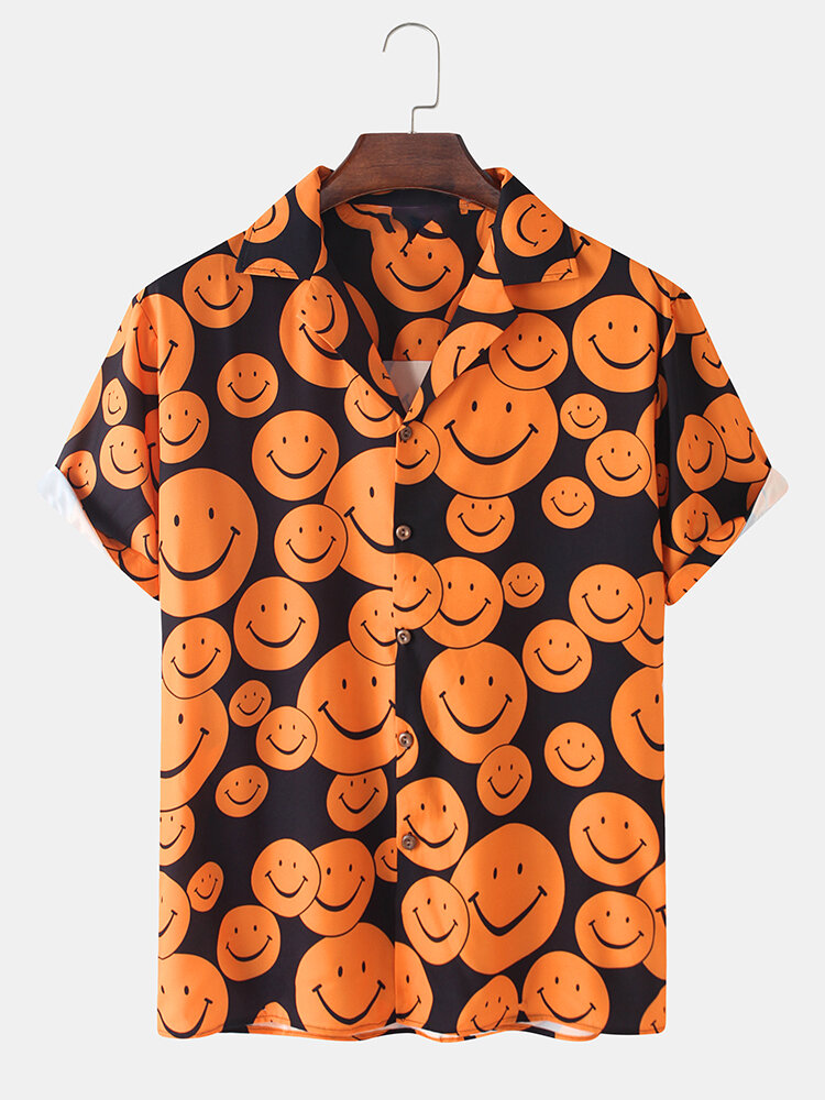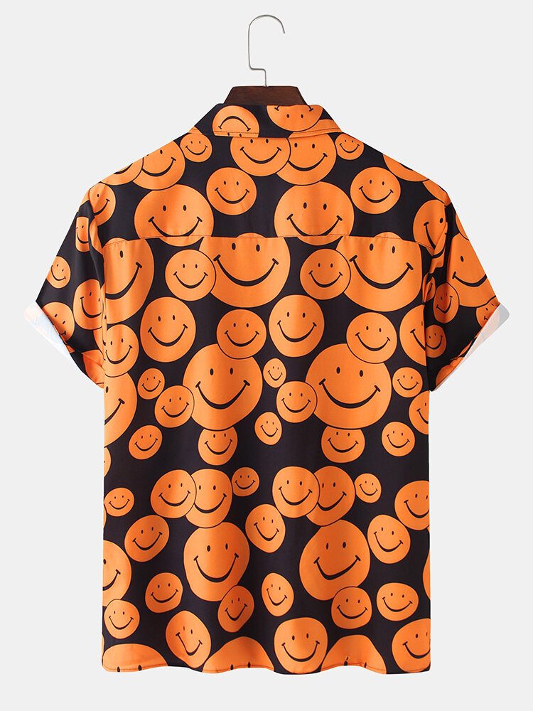 Mens Cartoon Smile Print Turn Down Collar Short Sleeve Shirts – Black S
