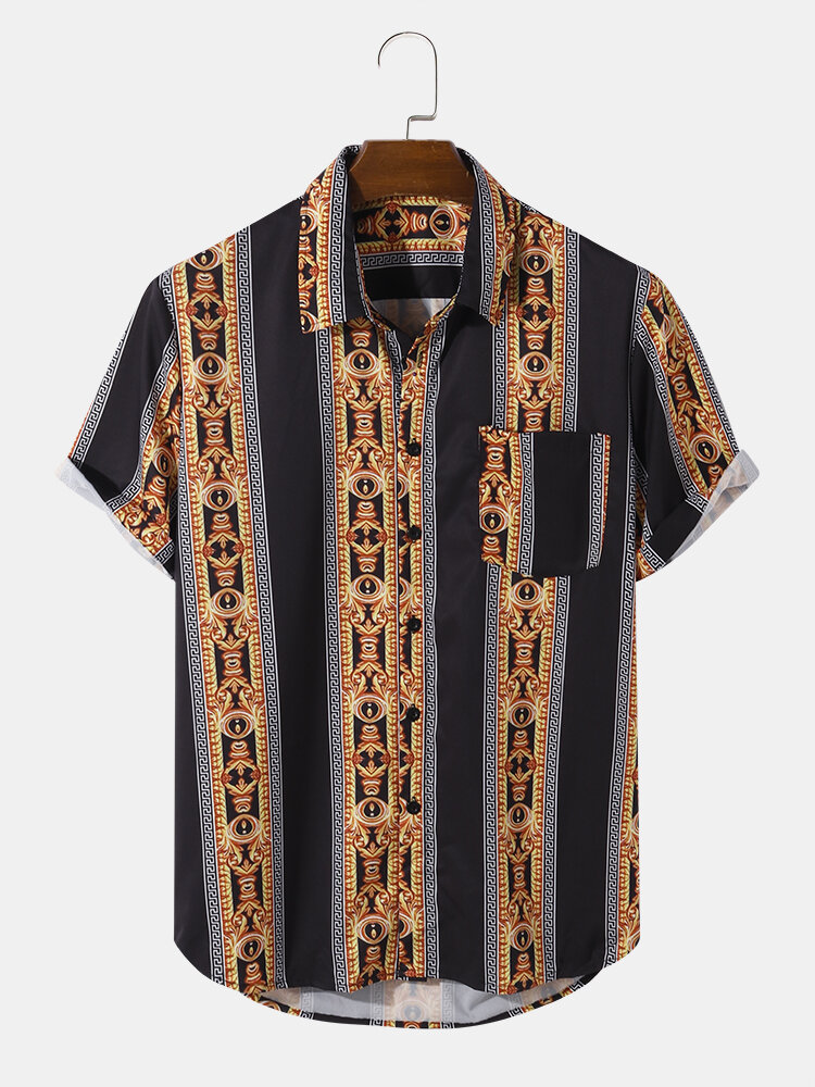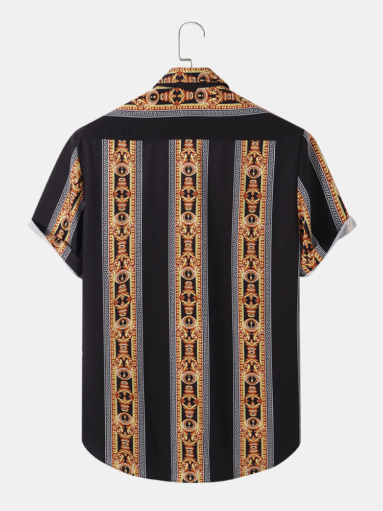 Mens Casual Baroque Striped Print Lapel Shirts – Black S