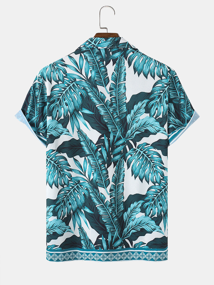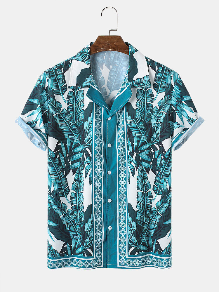 Mens Casual Baroque Style Plant Print Short Sleeve Shirts – Green S