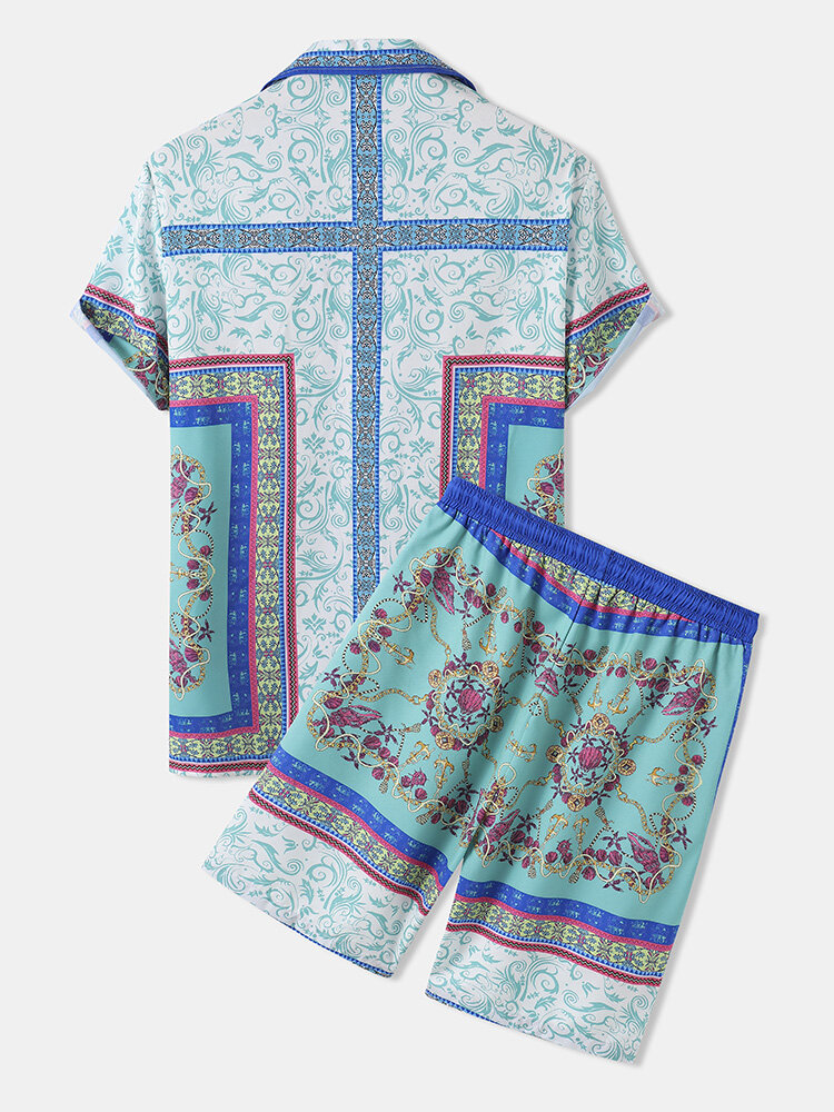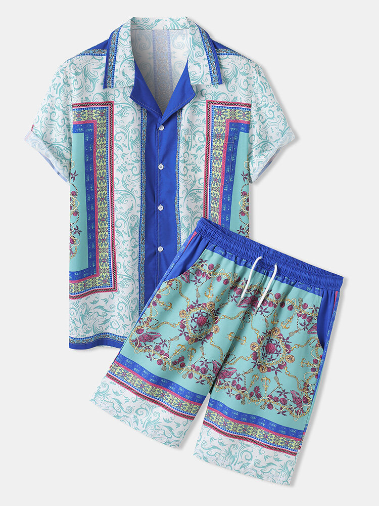 Mens Casual Baroque Style Suit Ethnic Pattern Print Shirts Shorts – Green S