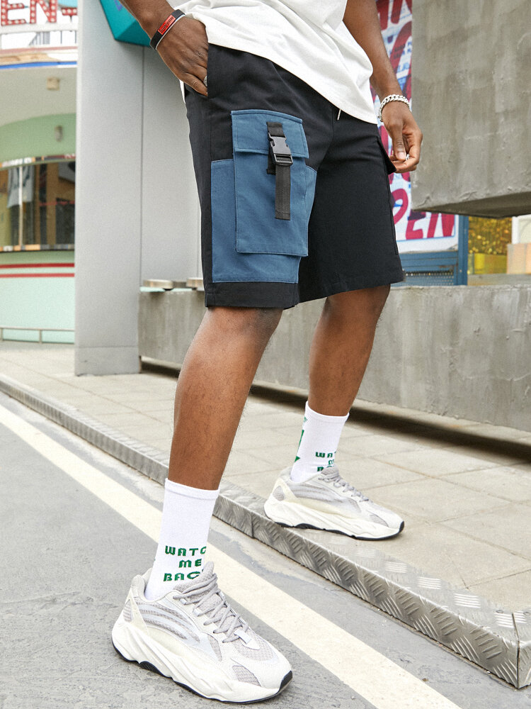 Mens Casual Big Pocket 100% Cotton Color Block Cargo Shorts – Black S