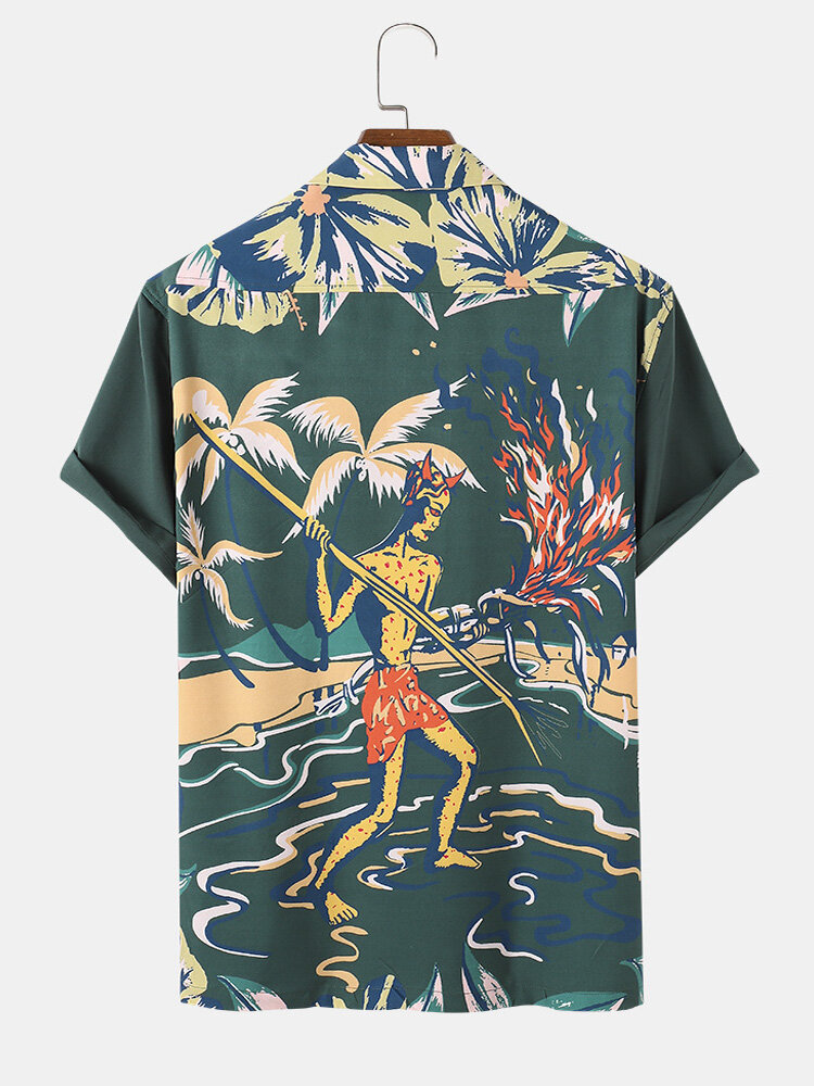 Mens Casual Cartoon Print Pocket Short Sleeve Shirts – Green S