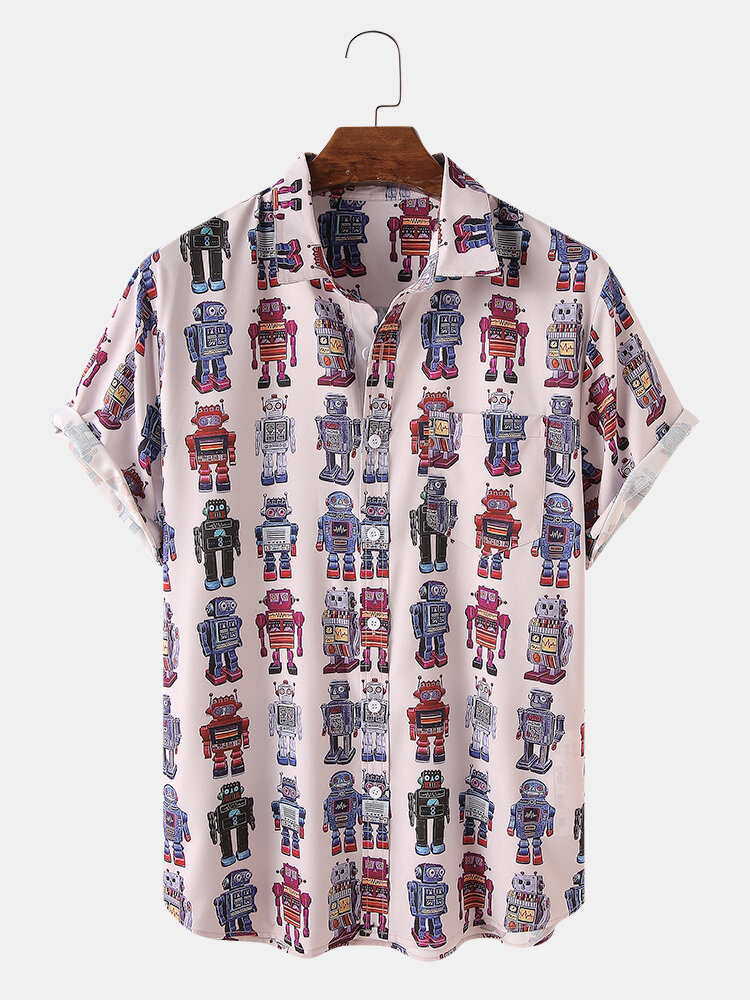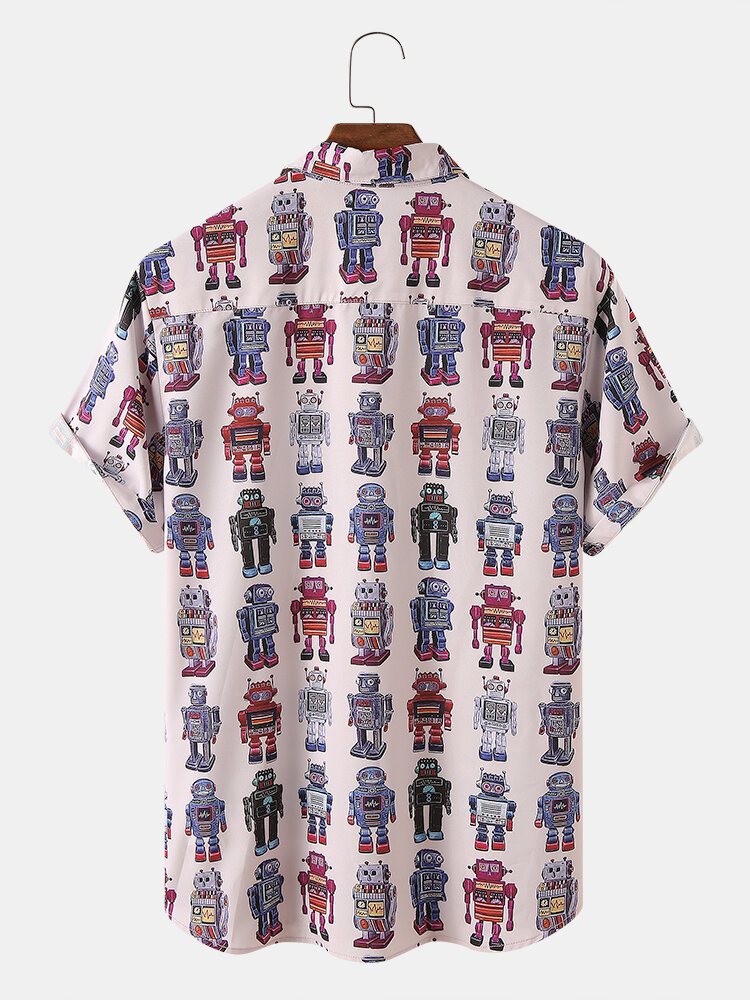 Mens Casual Colorful Robot Cartoon Turn Down Collar Shirts – Apricot M