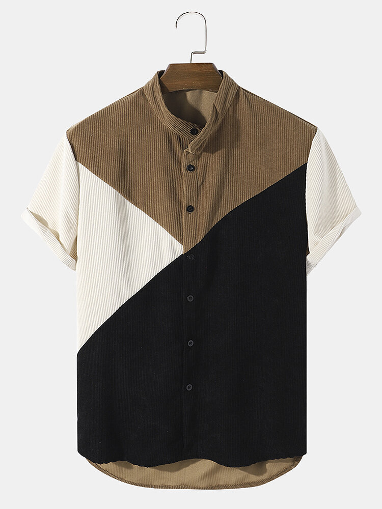 Mens Casual Corduroy Stand Collar Patchwork Shirts – Brown S