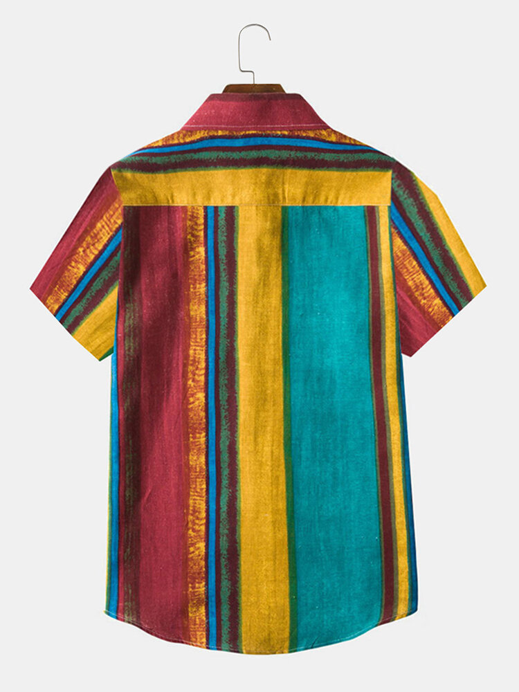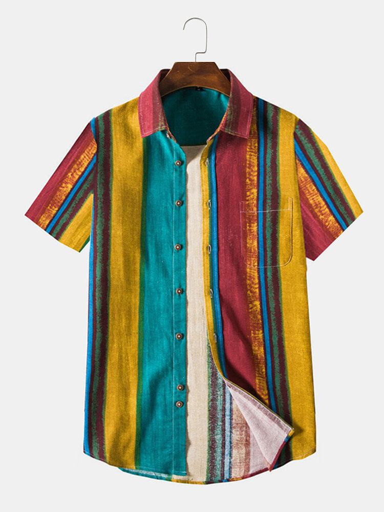 Decoration:ButtonFit Type:Regular FitMaterial:Polyester,CottonNeckline:LapelPattern Type:StripedScene:Leisure,Home,CasualSeason:SummerSize:L,S,XL,MSleeve:Short SleeveStyle:CasualThickness:RegularPackage Included: 1*Shirts