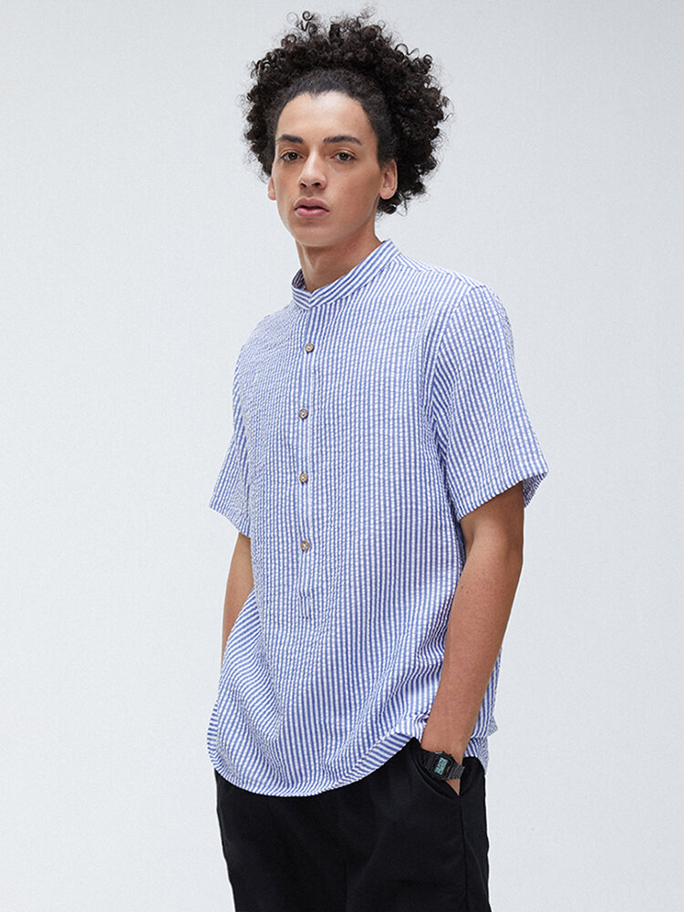 Brand:ChArmkpRClosure Type:Single BreastedCollar:Stand CollarColor:Blue,GreenCrafts:SewingCuff Type:Shirt SleevesDecoration:ButtonFit Type:FitLength:RegularMaterial:CottonOccasion:Casual,Home,LeisurePattern:StripedSeason:Spring,SummerSize:2XL,3XL,L,M,XLSleeve Length:Short SleeveStyle:Casual,Fashion,LeisureThickness:Regular