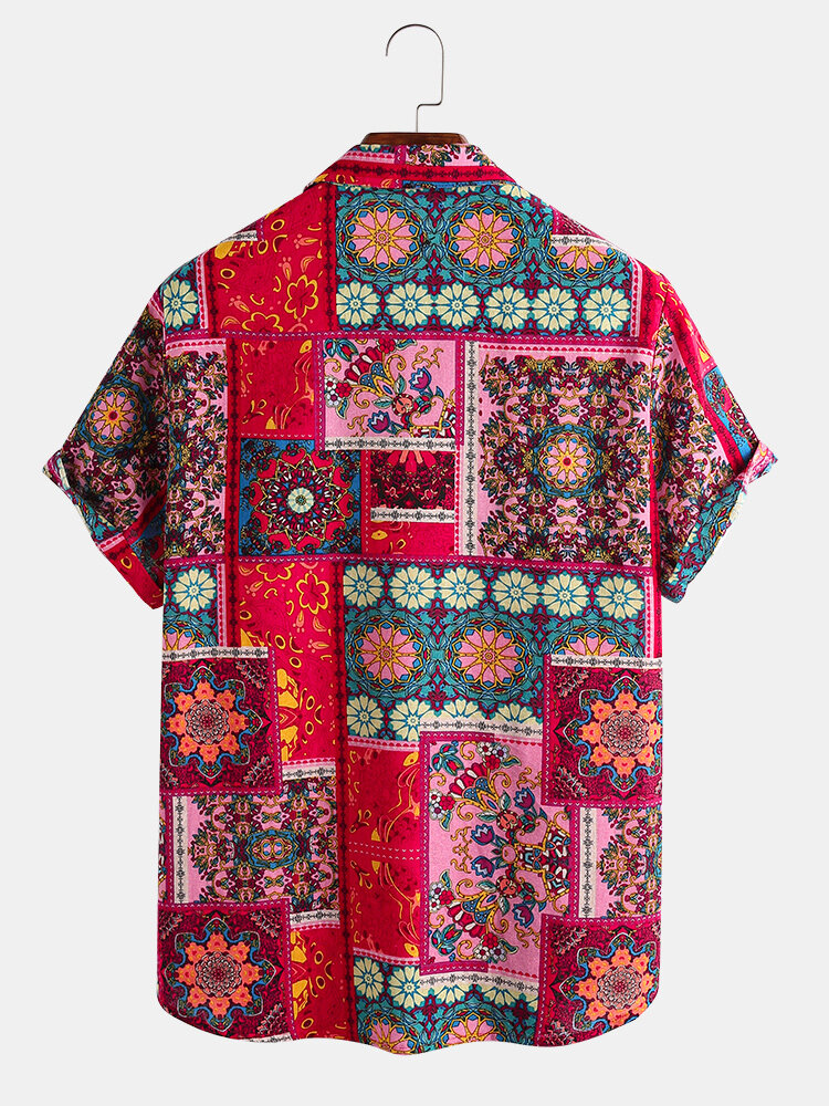 Mens Casual Ethnic Stylt Floral Printing Loose Fit Short Sleeve Leisure Shirts – Pink M