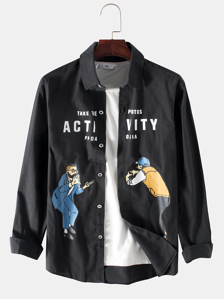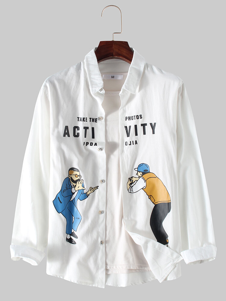 Mens Casual Figure Battle Cartoon Letter Print Long Sleeve Shirts – White L