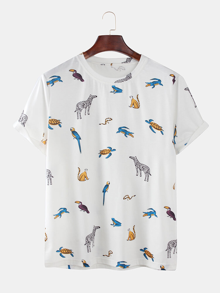 Mens Casual Funny Animals Cartoon Crew Neck Breathable T-Shirts – White L