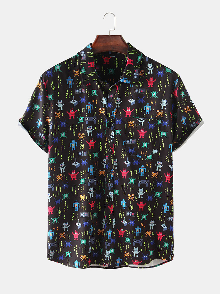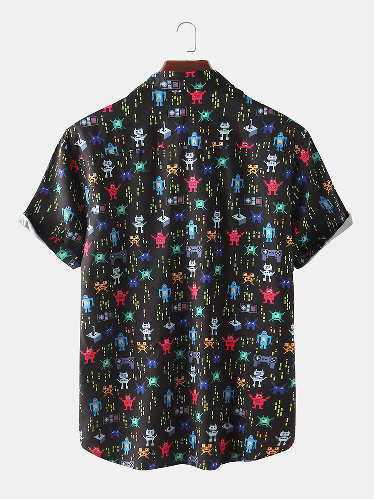 Mens Casual Funny Cartoon Robot Print Black Short Sleeve Shirts – Black 3XL