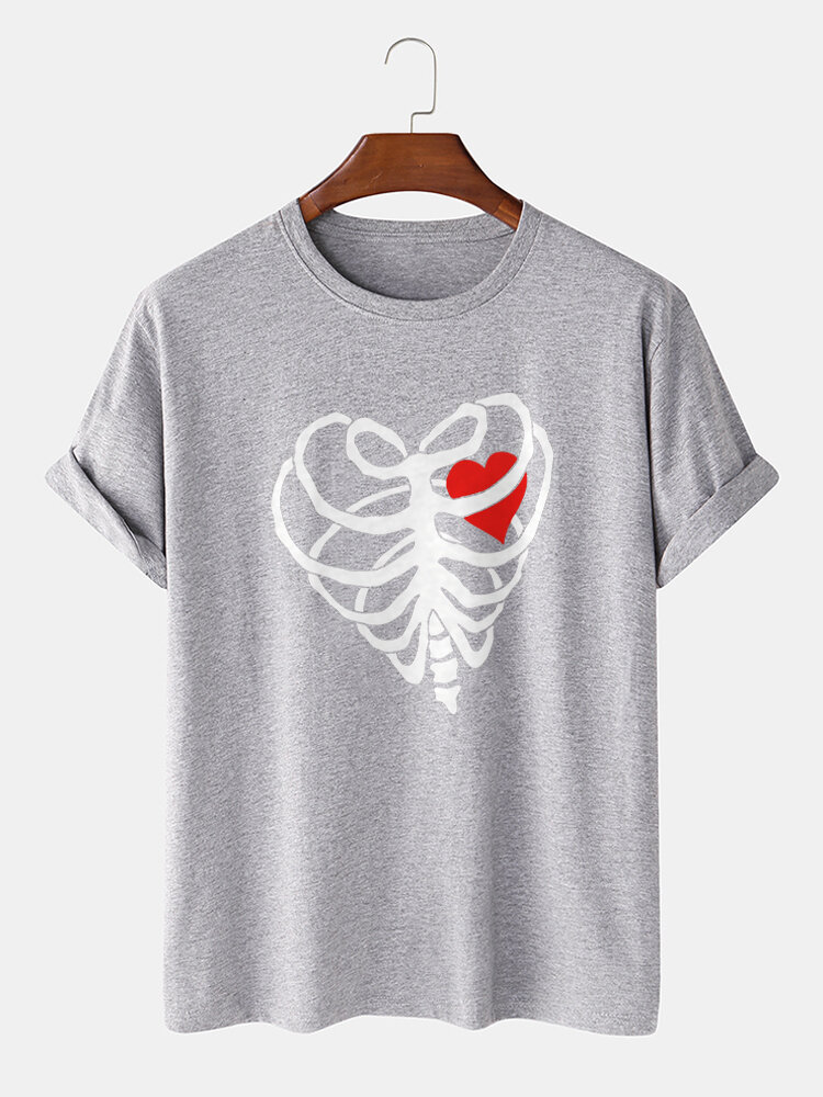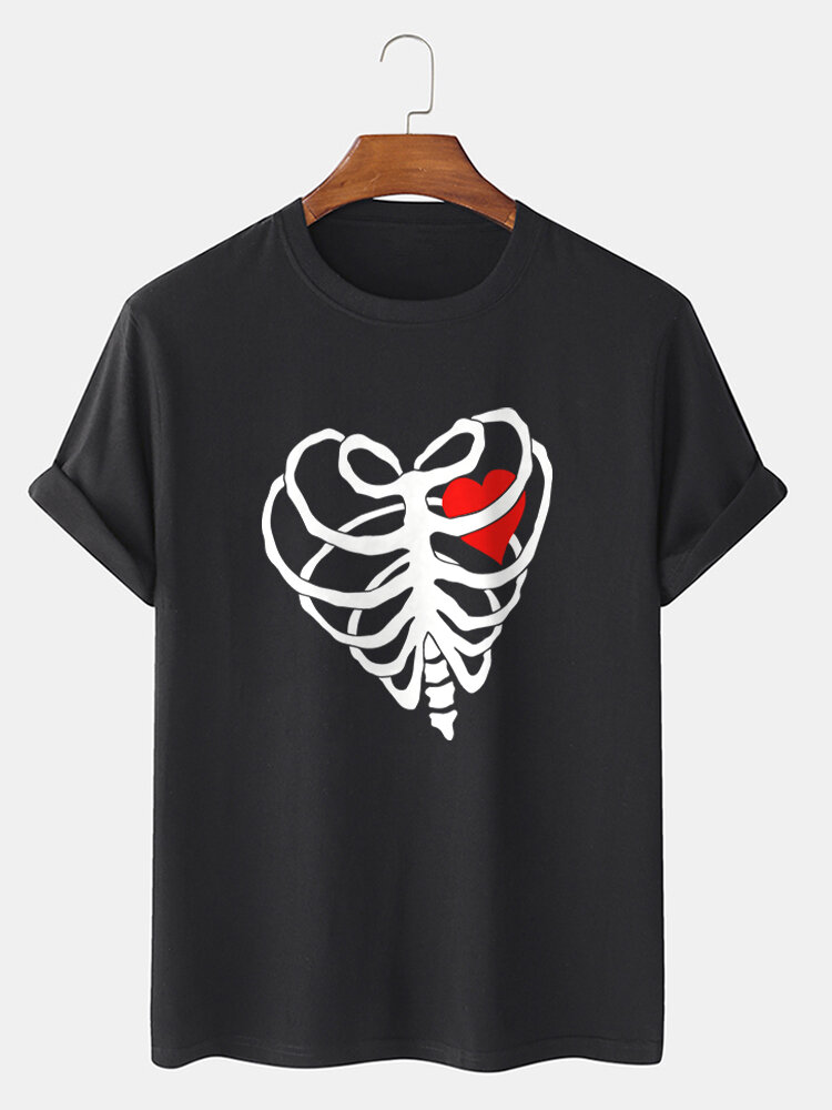 Mens Casual Heart-shaped Skeleton Cotton Hem Cuff T-shirt – Black XL