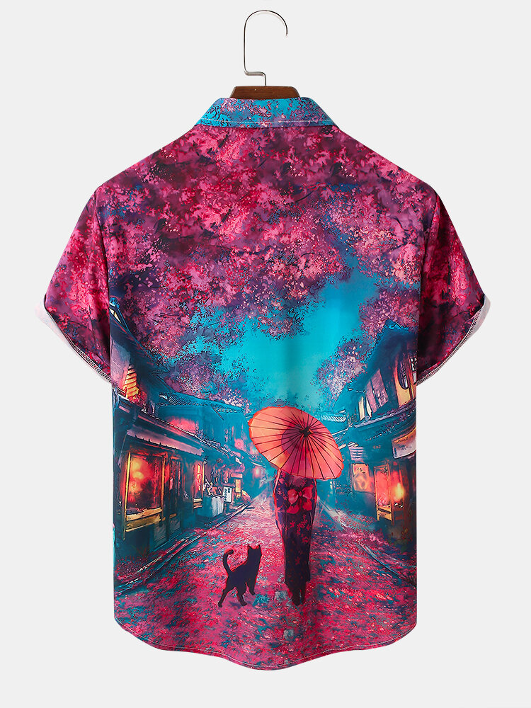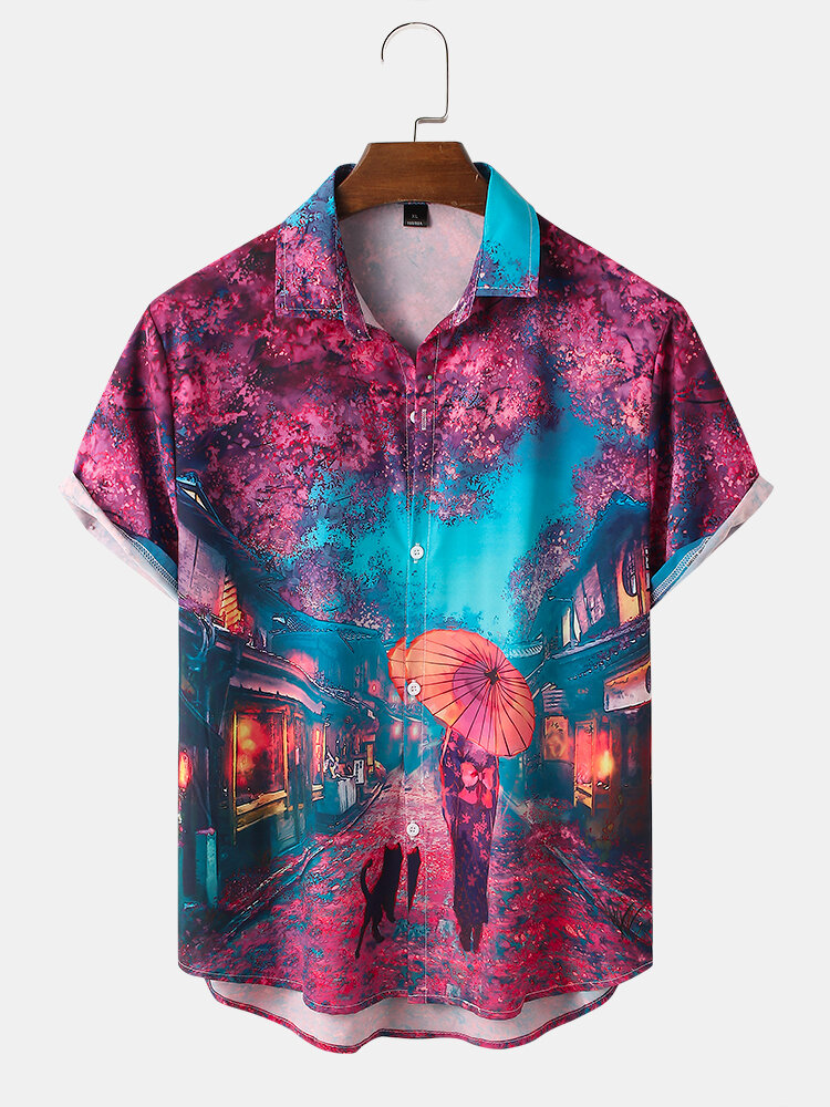 Mens Casual Landscape Figure Print Short Sleeve Shirts – Red 3XL