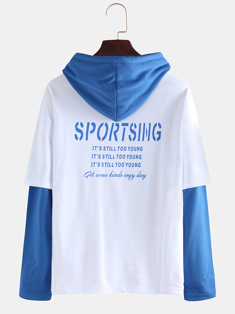 Mens Casual Patchwork Color Hooded Drawstring Long Sleeve Sweatshirt – S White