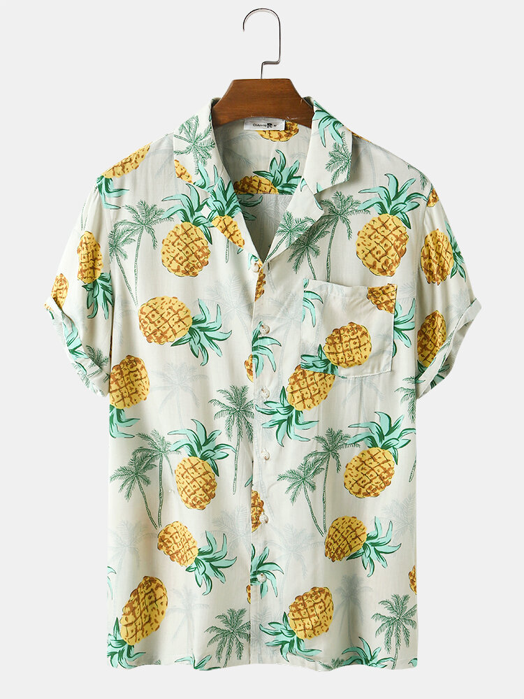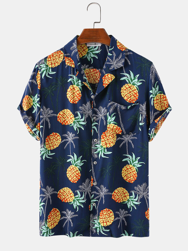 Mens Casual Pineapple Print Tropical Breathable Short Sleeve Shirts – Navy 2XL