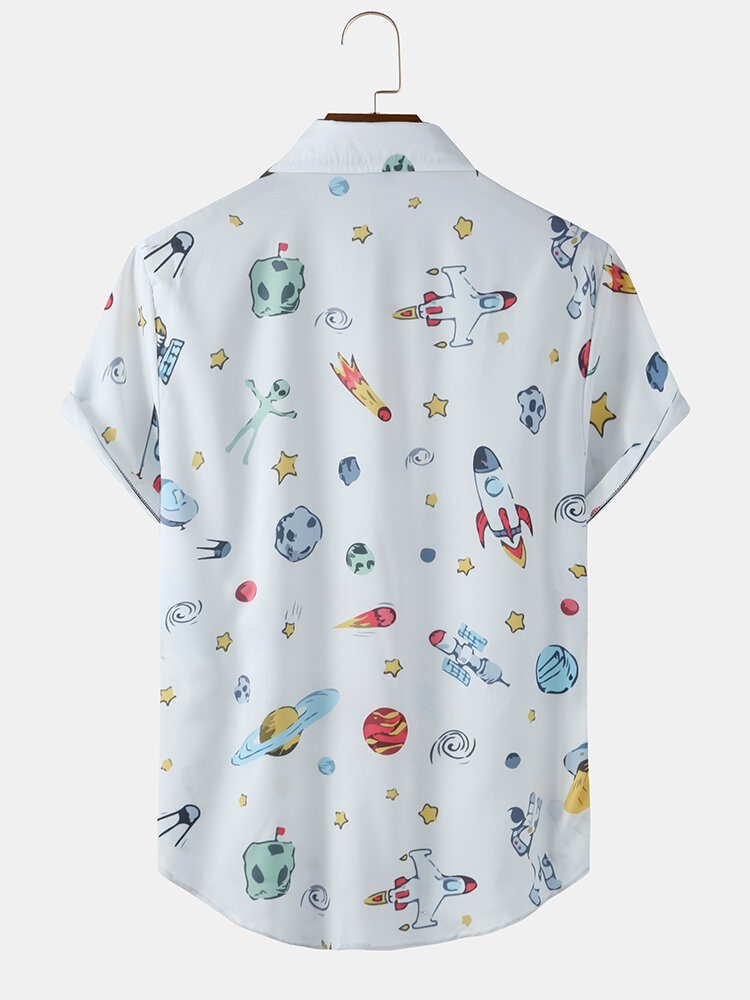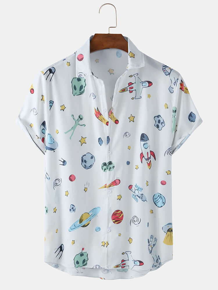 Mens Casual Space Cartoon Funny Breathable Short Sleeve Shirts – White 2XL