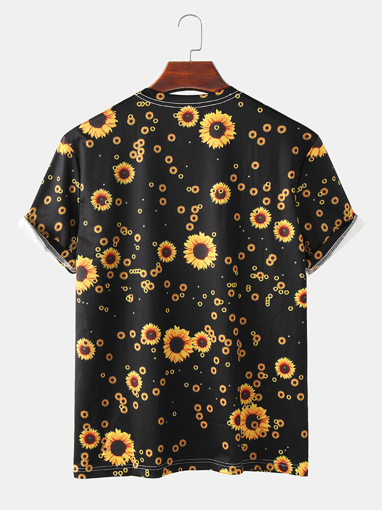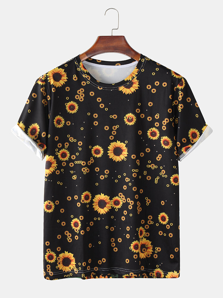 Mens Casual Sunflowers Print Crew Neck Short Sleeve T-Shirts – Black L