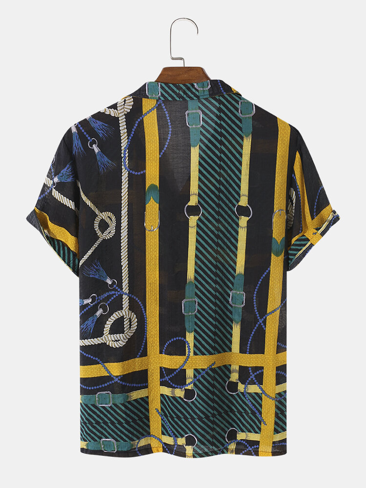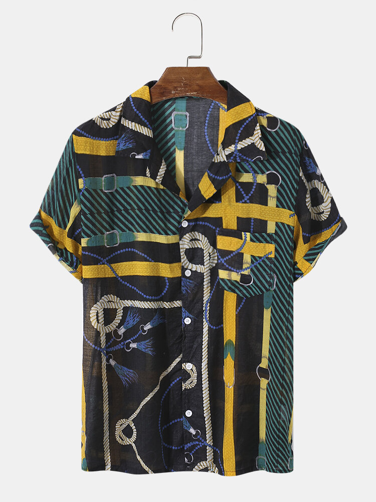 Mens Casual Twill & Rope Print Revere Collar Shirts – Black S