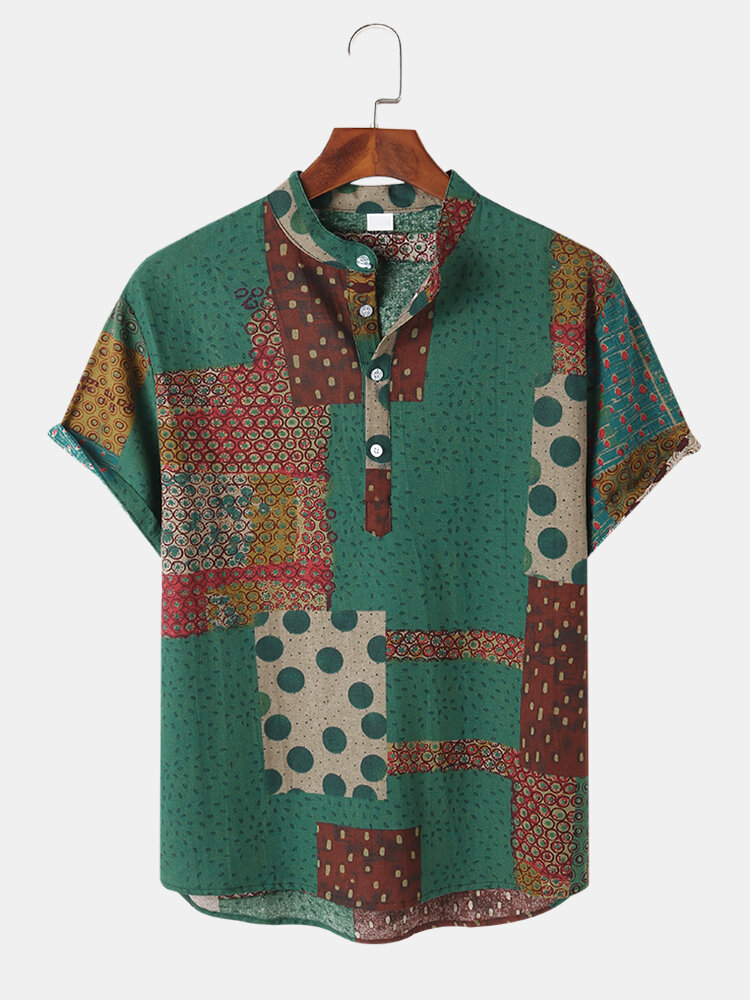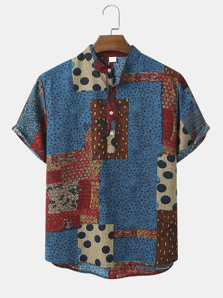 Decoration:PatternFit Type:Regular FitMaterial:CottonNeckline:LapelPattern Type:PatchworkScene:Leisure,Home,CasualSeason:SummerSize:XXL,L,S,XL,MSleeve:Short SleeveStyle:Vintage,CasualThickness:Regular