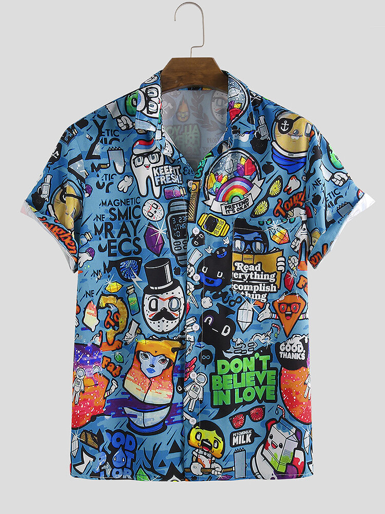 Mens Character Printing Turn Down Collar Casual Shirts – Blue L