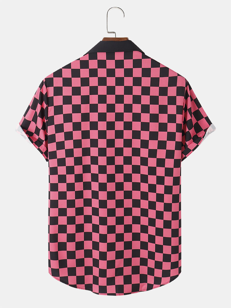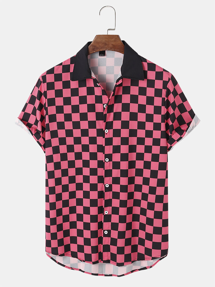 Mens Checkerboard Pattern Short Sleeve Casual Shirts – Red M