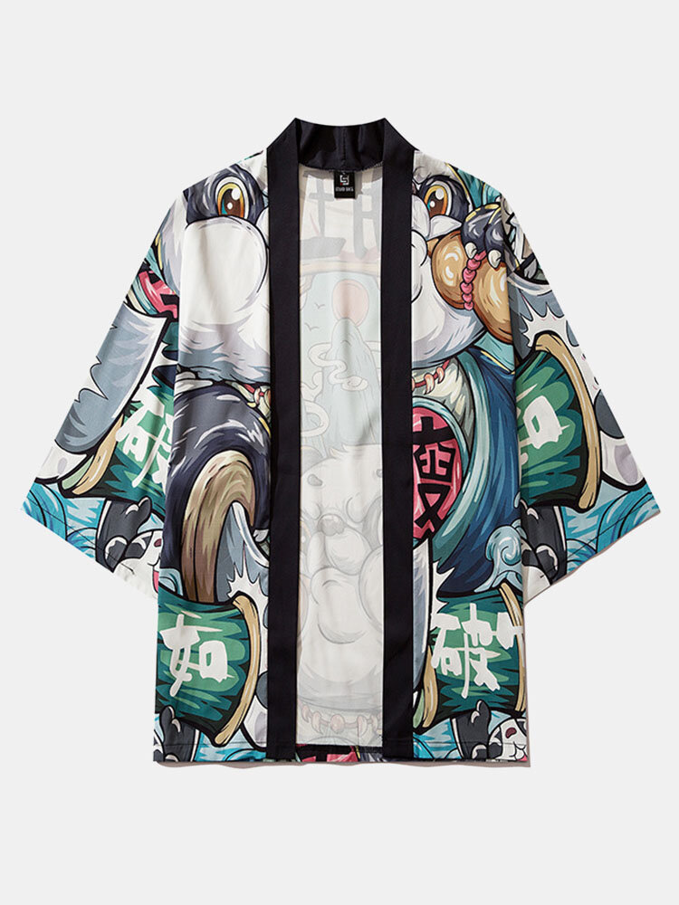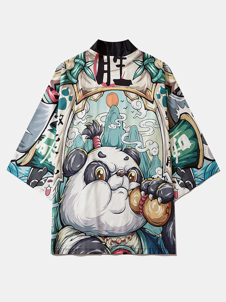 Mens Chinese Cartoon Panda Print Open Front Kimono – Multicolor L