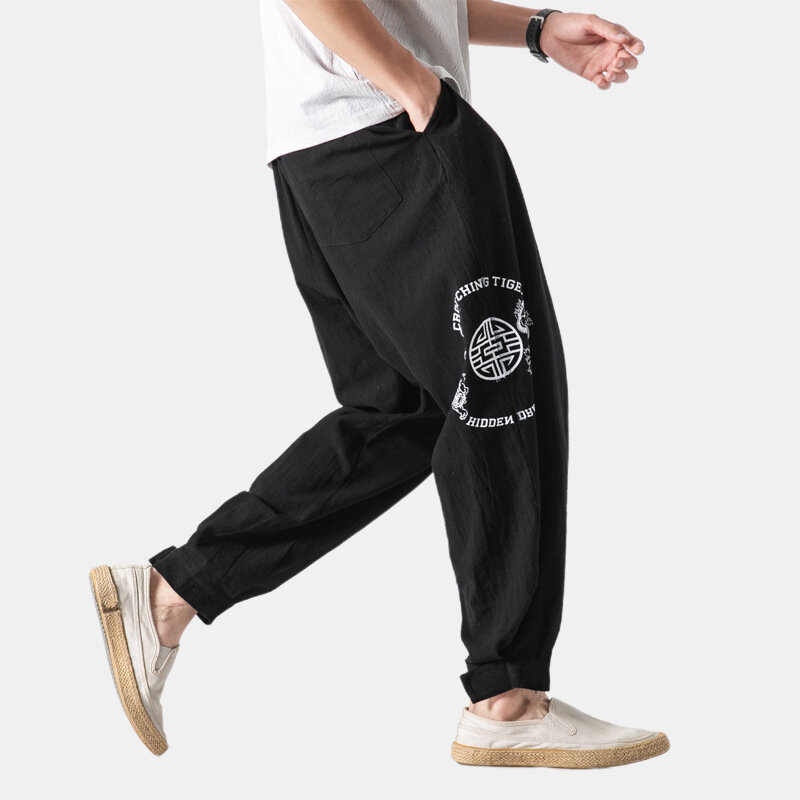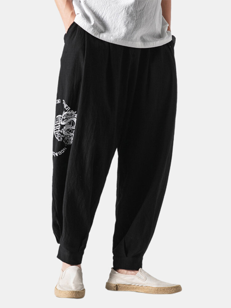 Mens Chinese Style Loose Linen Printing Solid Color Casual Pants – 2XL Black