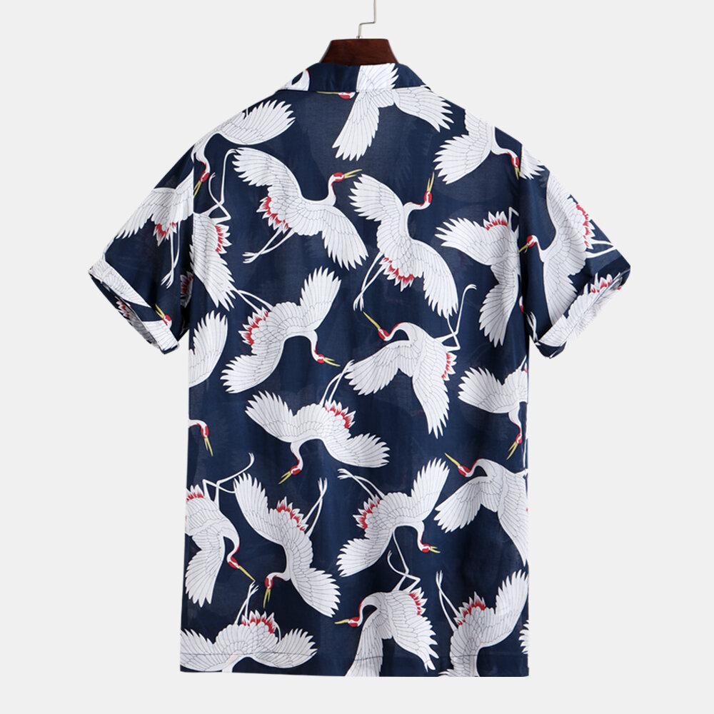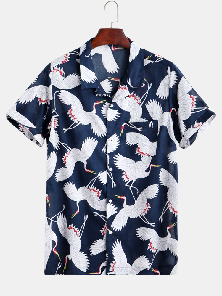 Mens Chinese Summer Exquisite Crane Printing Useful Pocket Casual Shirts – XL Blue