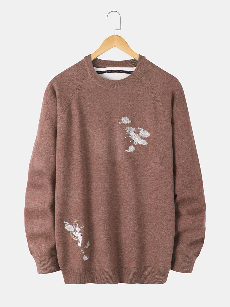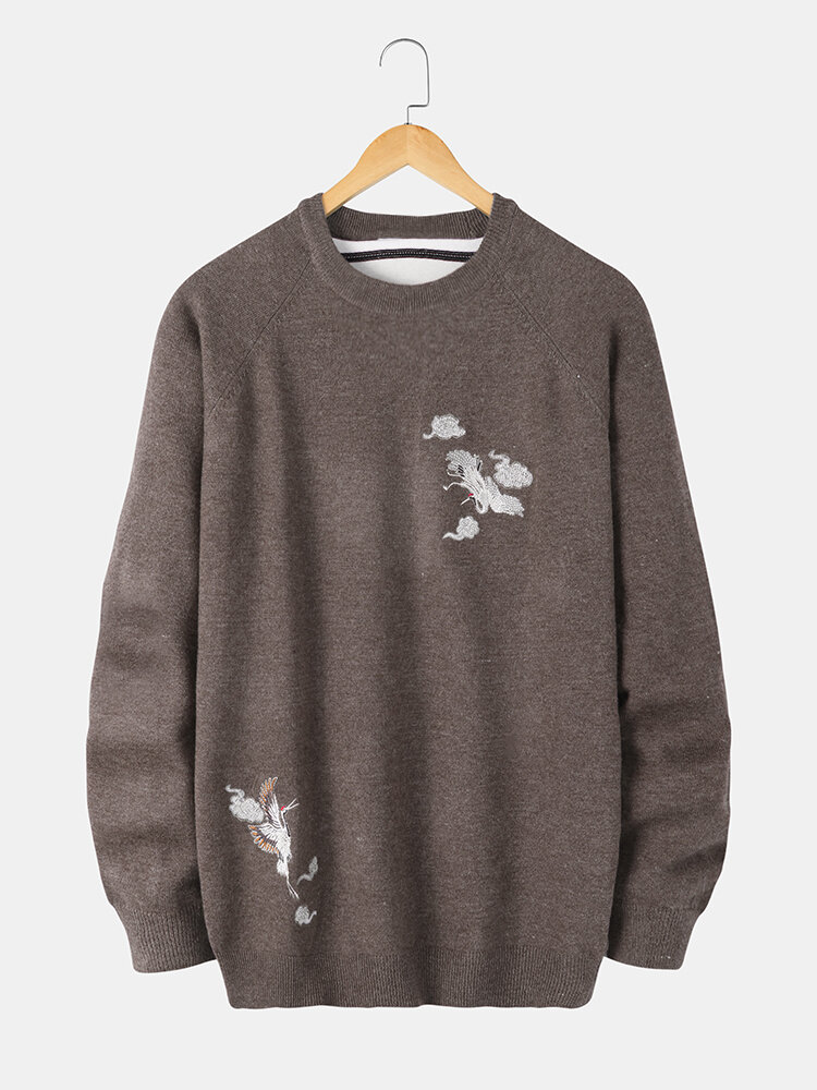 Mens Chinoiserie Crane Embroidery Raglan Sleeve Warm Knitted Sweaters – Brown S