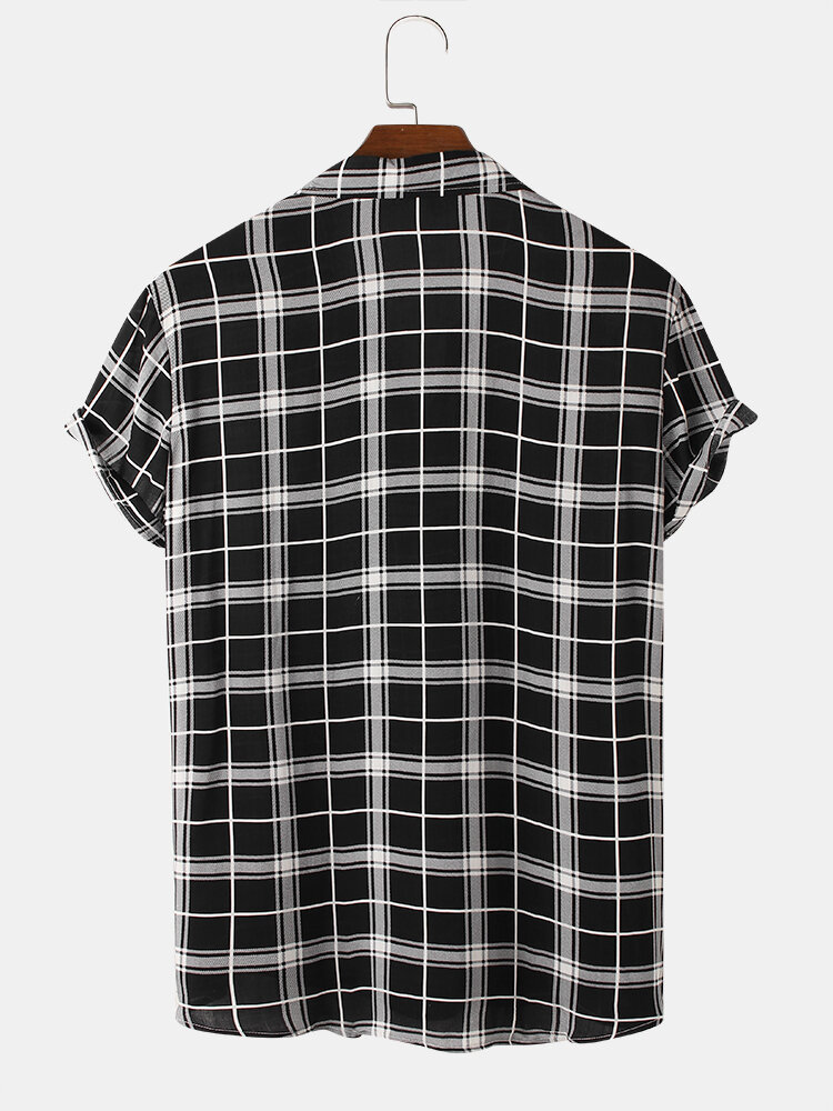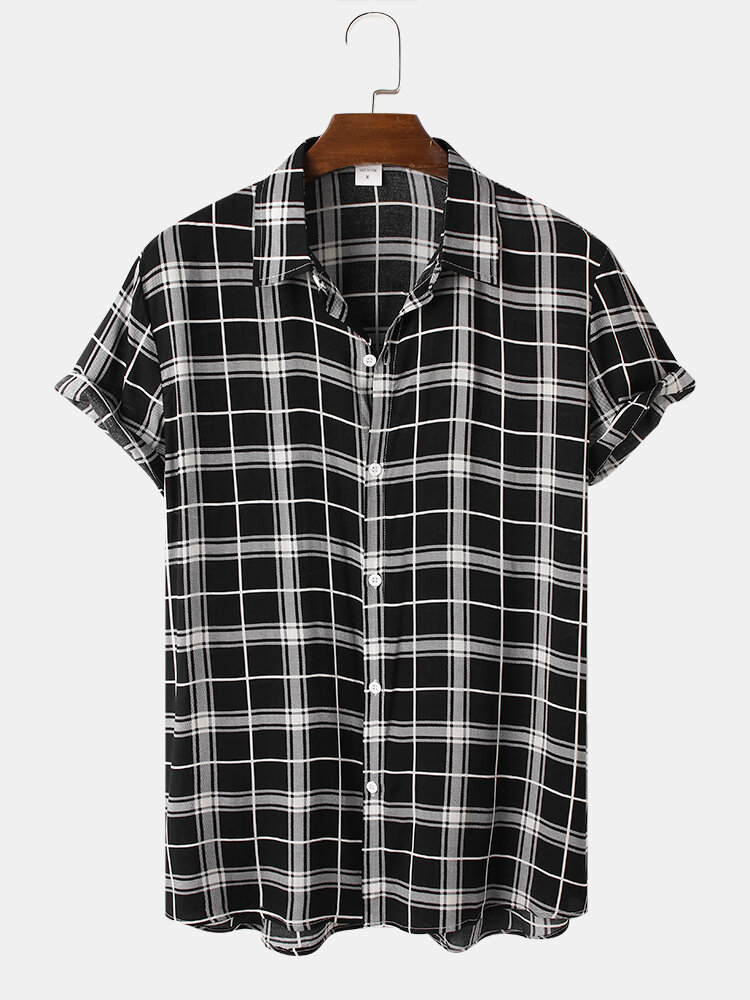 Mens Classic Plaid Print Lapel Casual Short Sleeve Button Shirts – Black S