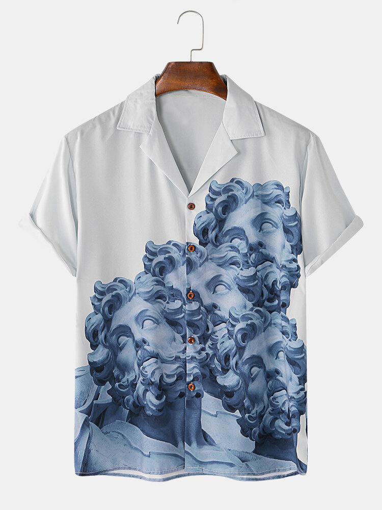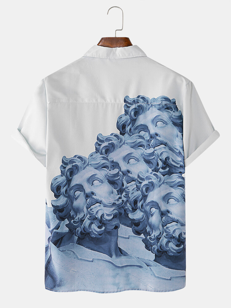Mens Classicism Statue Pirnt Revere Collar Short Sleeve Casual Shirts – White S