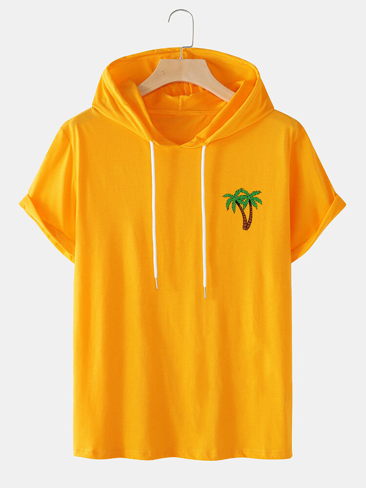 Mens Coconut Tree Hooded Chest Print Casual T-Shirts – Black XL