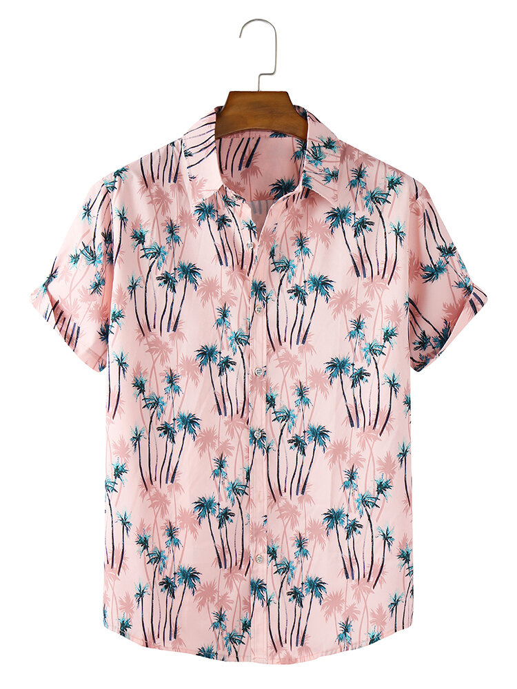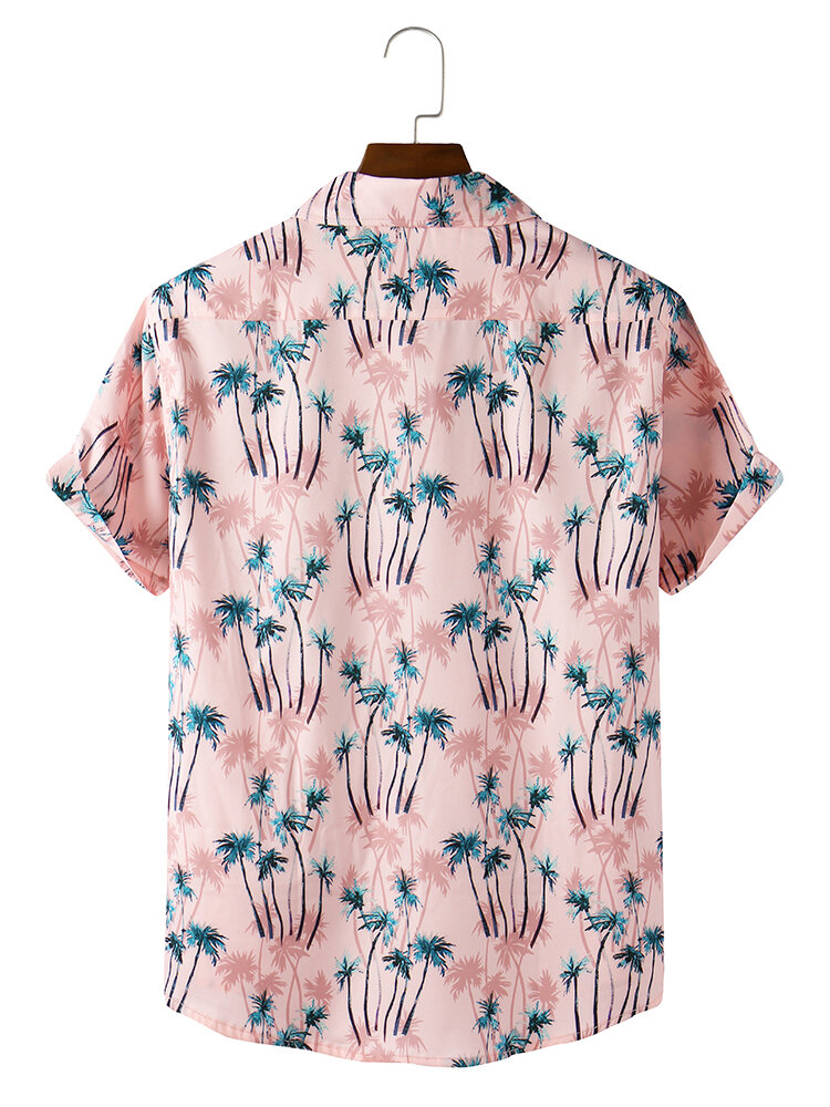 Mens Coconut Tree Print Tropical Holiday Casual Light Short Sleeve Shirts – Pink S