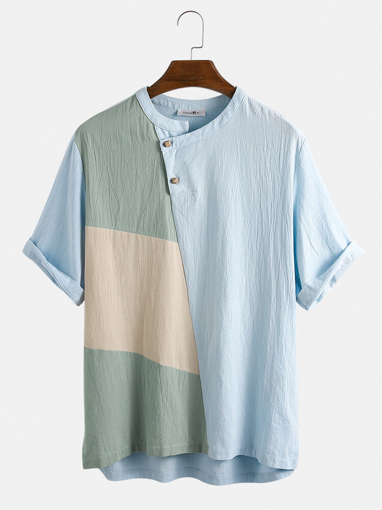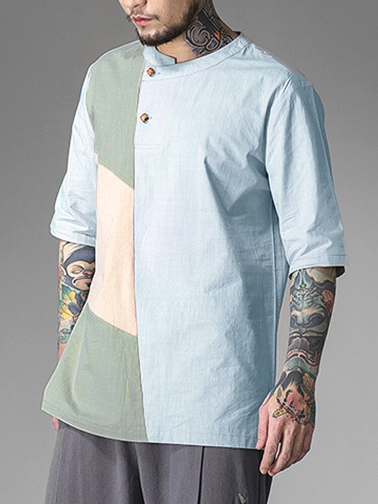 Description:Item Type: T-ShirtsPattern Type: PatchworkGender: MenFit Type: FitStyle: Casual,FashionThickness: RegularCollar: Stand CollarSeason: SummerDecorations: ButtonsMaterial: 100% CottonSleeve Length: Short SleeveColor: White,GreenCuff Type: Shirt SleeveOccasion: Leisure,Home,Daylife