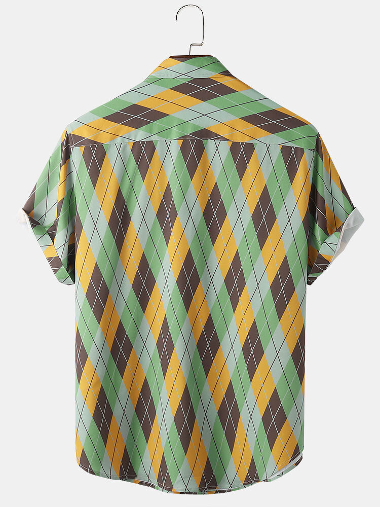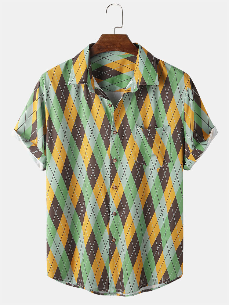Mens Color Block Contrast Geometric Lapel Short Sleeve Shirt – Yellow S