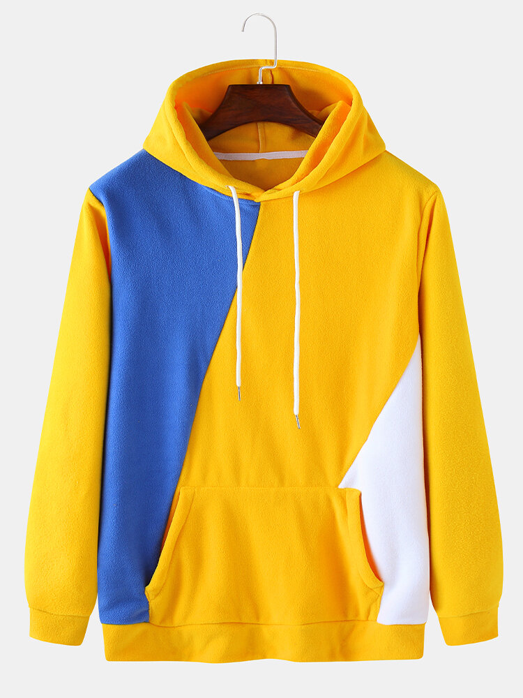 Mens Color Block Kangaroo Pocket Casual Drawstring Hoodies – Yellow M