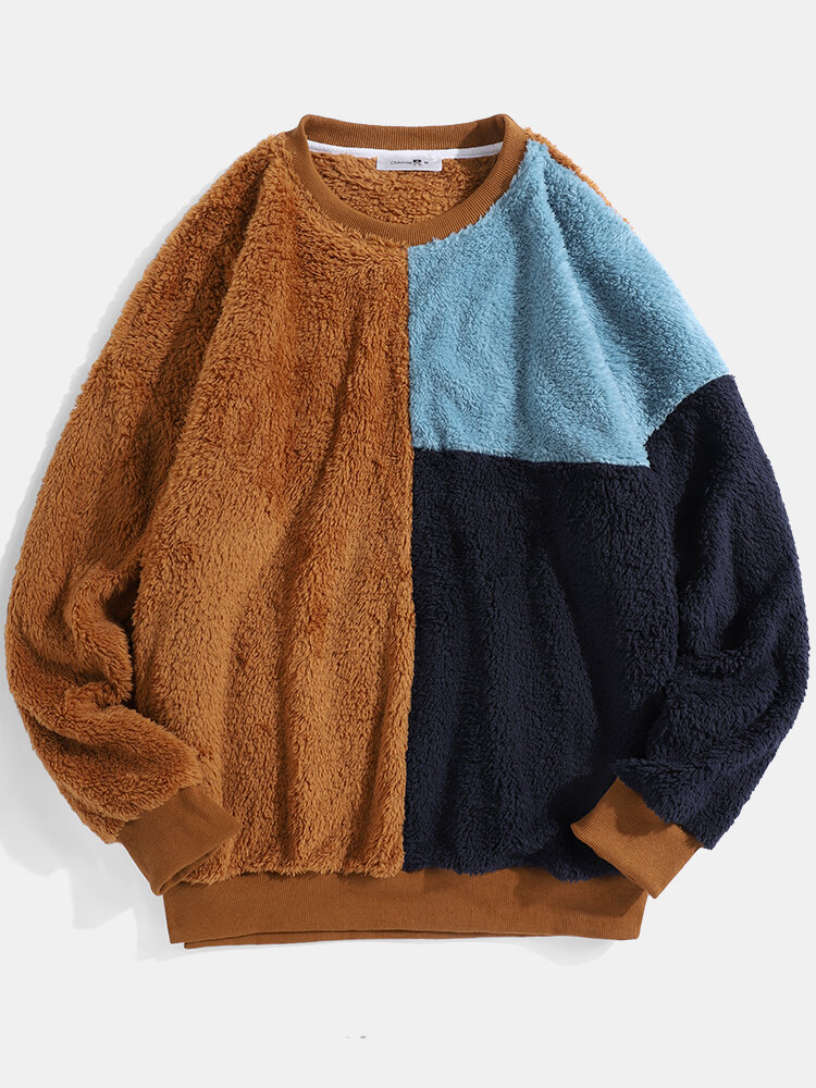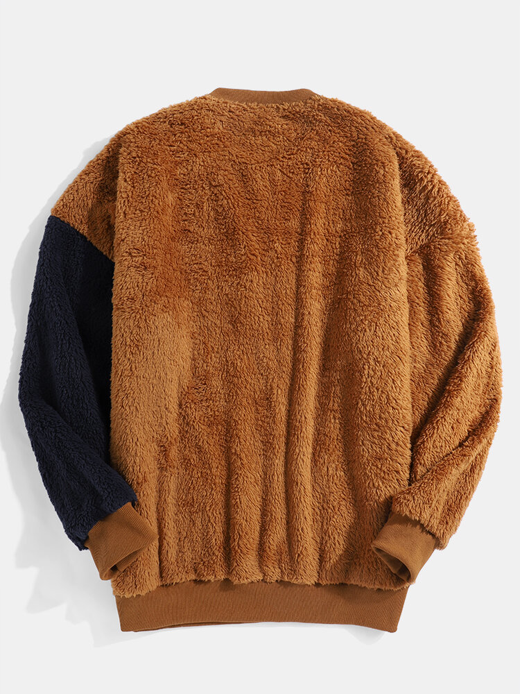 Mens Color Block Patchwork Fluffy Plush Loose Pullover Teddy Sweatshirts – Khaki S