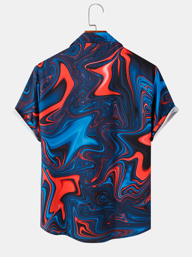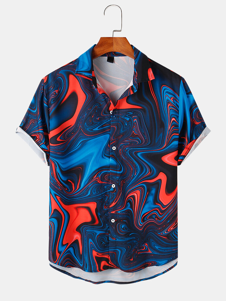 Mens Color Contrast Wave Lapel Short Sleeve Shirt – Red S