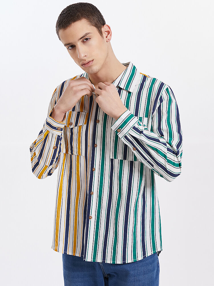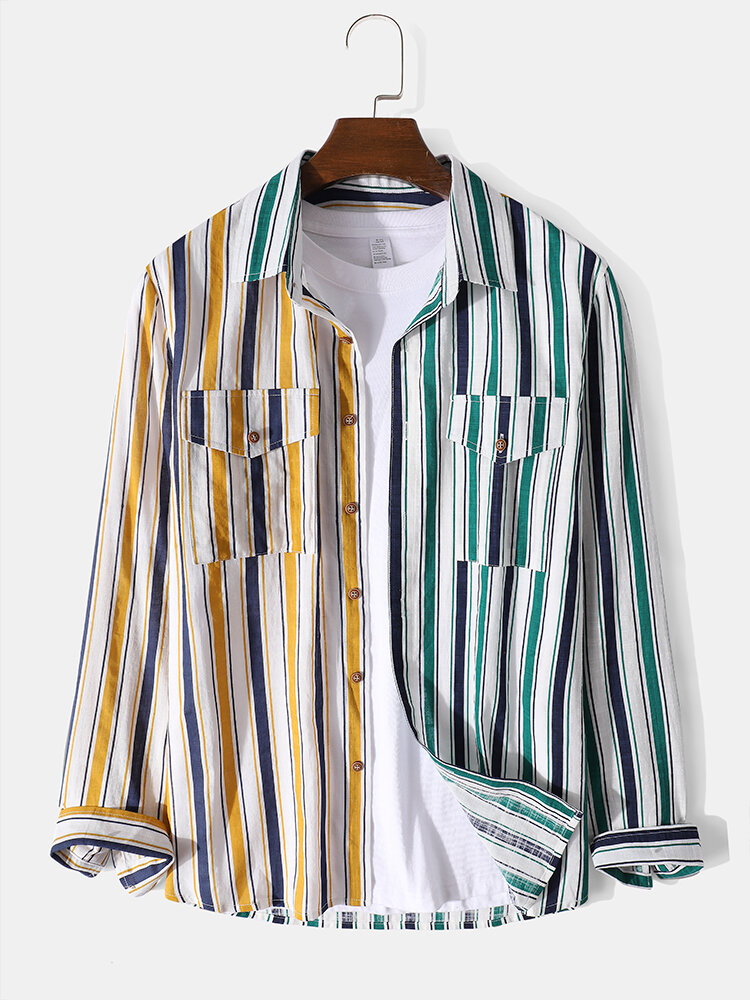 Mens Colored Stripe Patchwork Lapel Long Sleeve Shirts With Flap Pocket – Green S