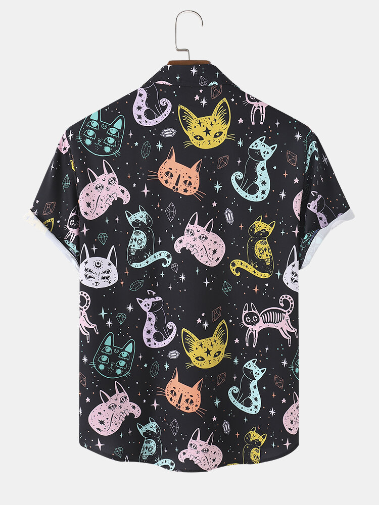 Mens Colorful Cartoon Cat Print Lapel Short Sleeve Shirt – Black S